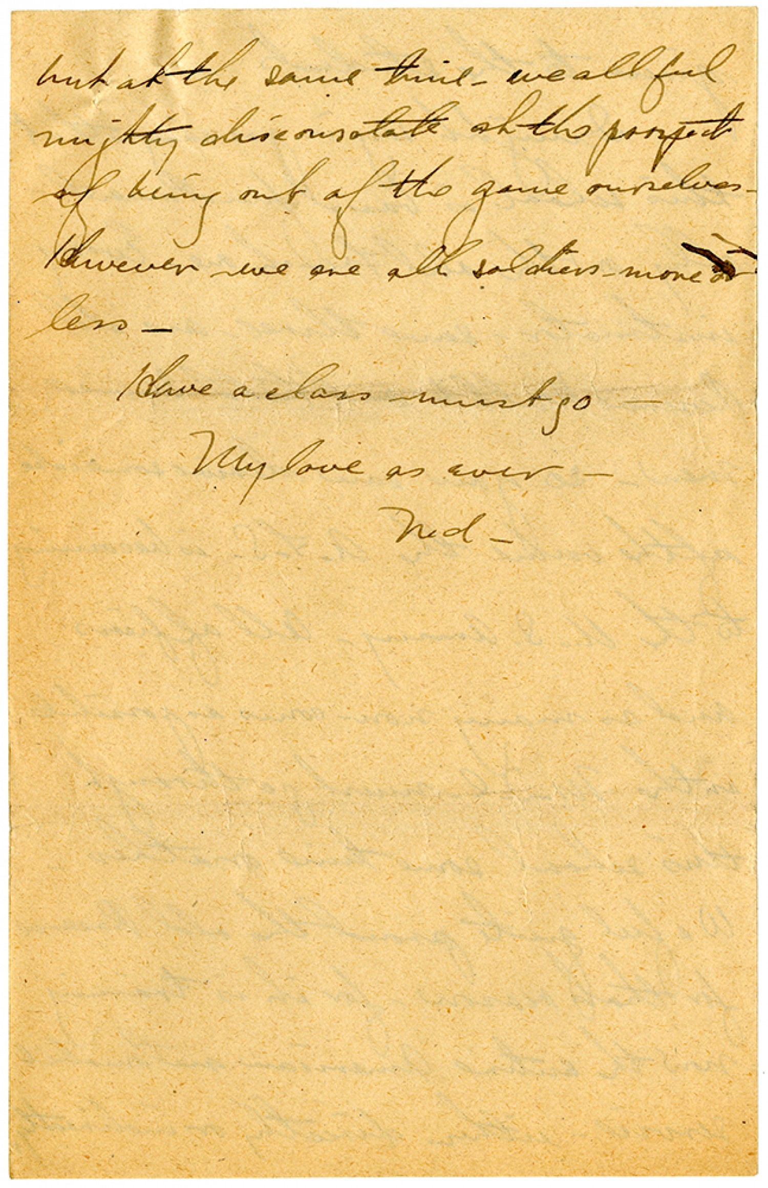 but at the same time - we all feel mighty disconsolate at the prospect of being out of the game ourselves. However we are all soldiers - more or less. Have a class - must go - My love as ever - Ned.