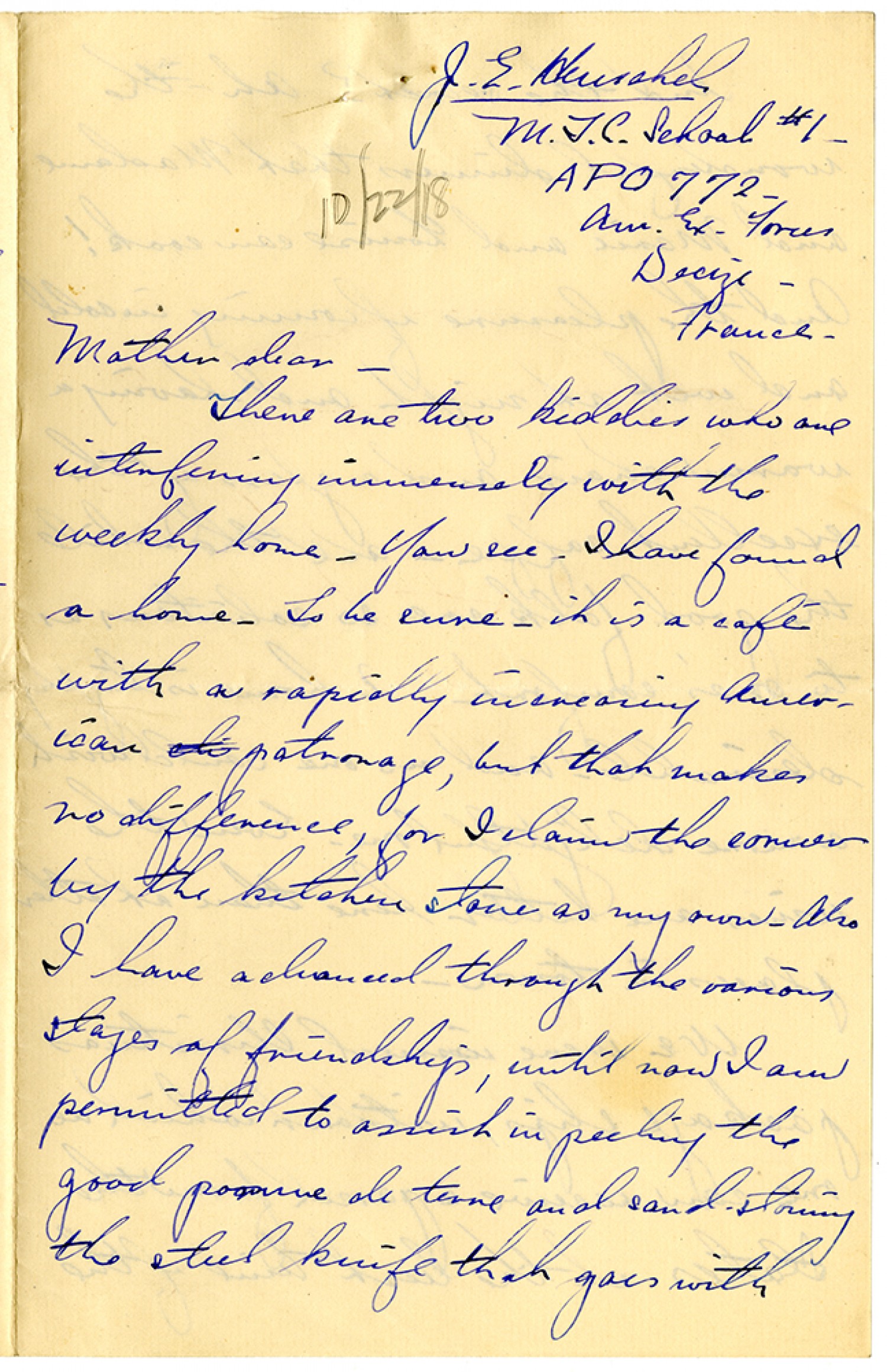 J.E. Henschel M.T.C. School #1 - APO 772 - Am. Ex. Forces Decize - France - [October 22, 1918] Mother dear - There are two kiddies who are interfering immensely with the weekly home. You see - I have found a home. To be sure - it is a cafe with a rapidly increasing American patronage, but that makes no difference, for I claim the corner by the kitchen stove as my own. Also I have advanced through the various stages of friendship, until now I am permitted to assist in peeling the good [ms illegible: 1 wd] de terne and sad-storing the steel knife that goes with