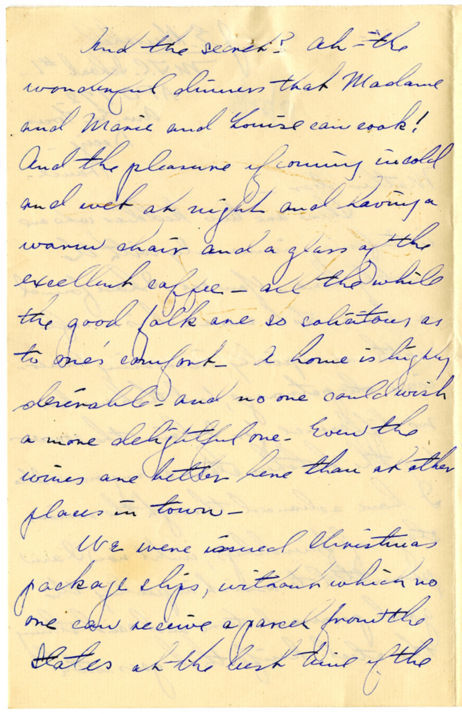 And the secret? Oh - the wonderful dinners that Madame and Marie and Louise can cook! And the pleasure of coming in cold and wet at night and having a warm chair and a glass of the excellent coffee - all the while the good folk are so solicitous as to one's comfort. A home is highly desirable - and no one could wish a more delightful one. Even the wines are better here than at other places in town. We were issued Christmas package slips, without which no one can receive a parcel from the States at the best time of the