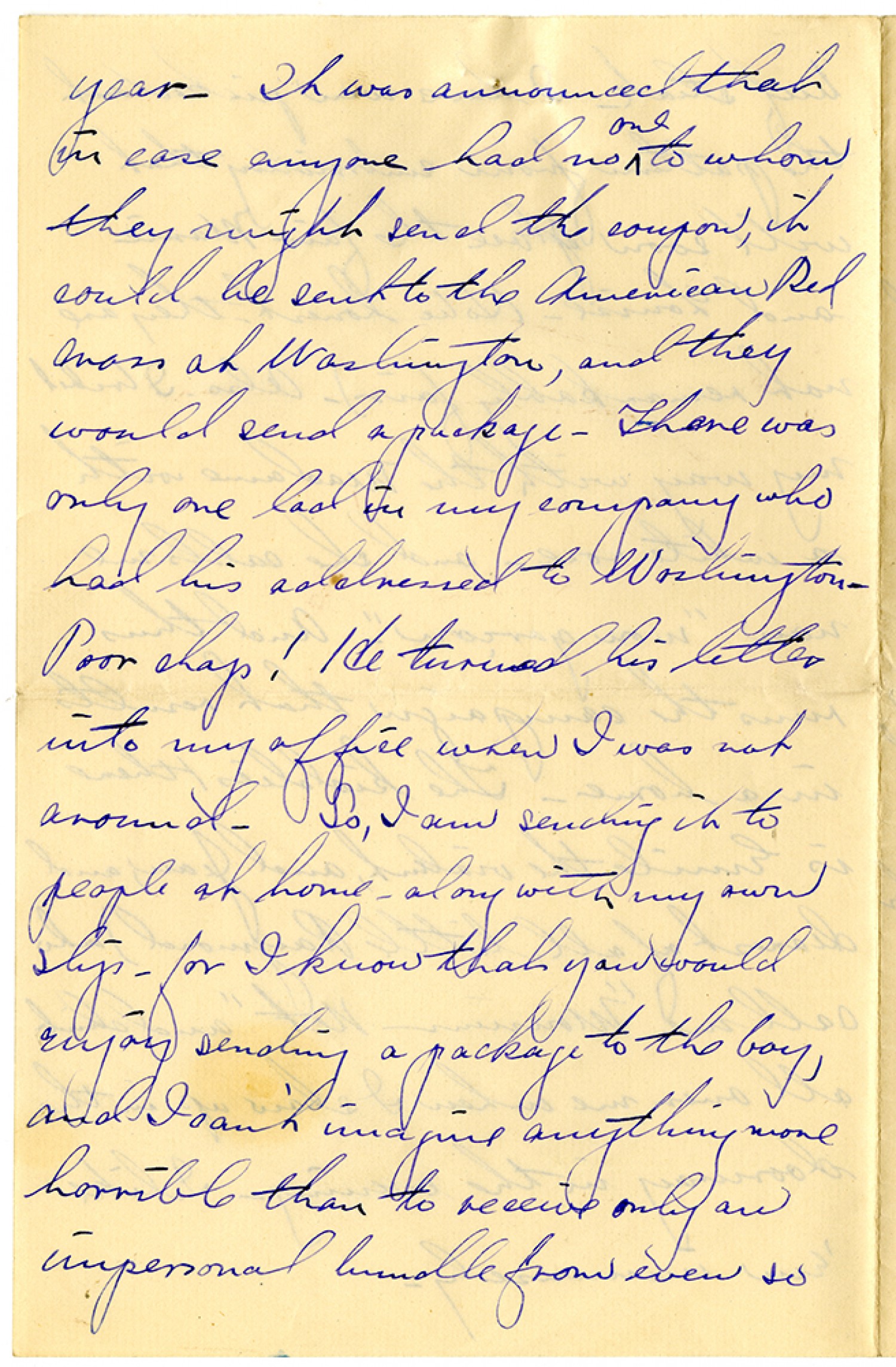 year. It was announced that in case anyone had no one to whom they might send the coupon, it could be sent to the American Red Cross at Washington, and they would send a package. There was only one lad in my company who had his addressed to Washington - Poor chap! He turned his letter into my office when I was not around. So, I am sending it to people at home - along with my own slip - for I know that you would enjoy sending a package to the boy, and I can't imagine anything more horrible than to receive only an impersonal bundle from even so