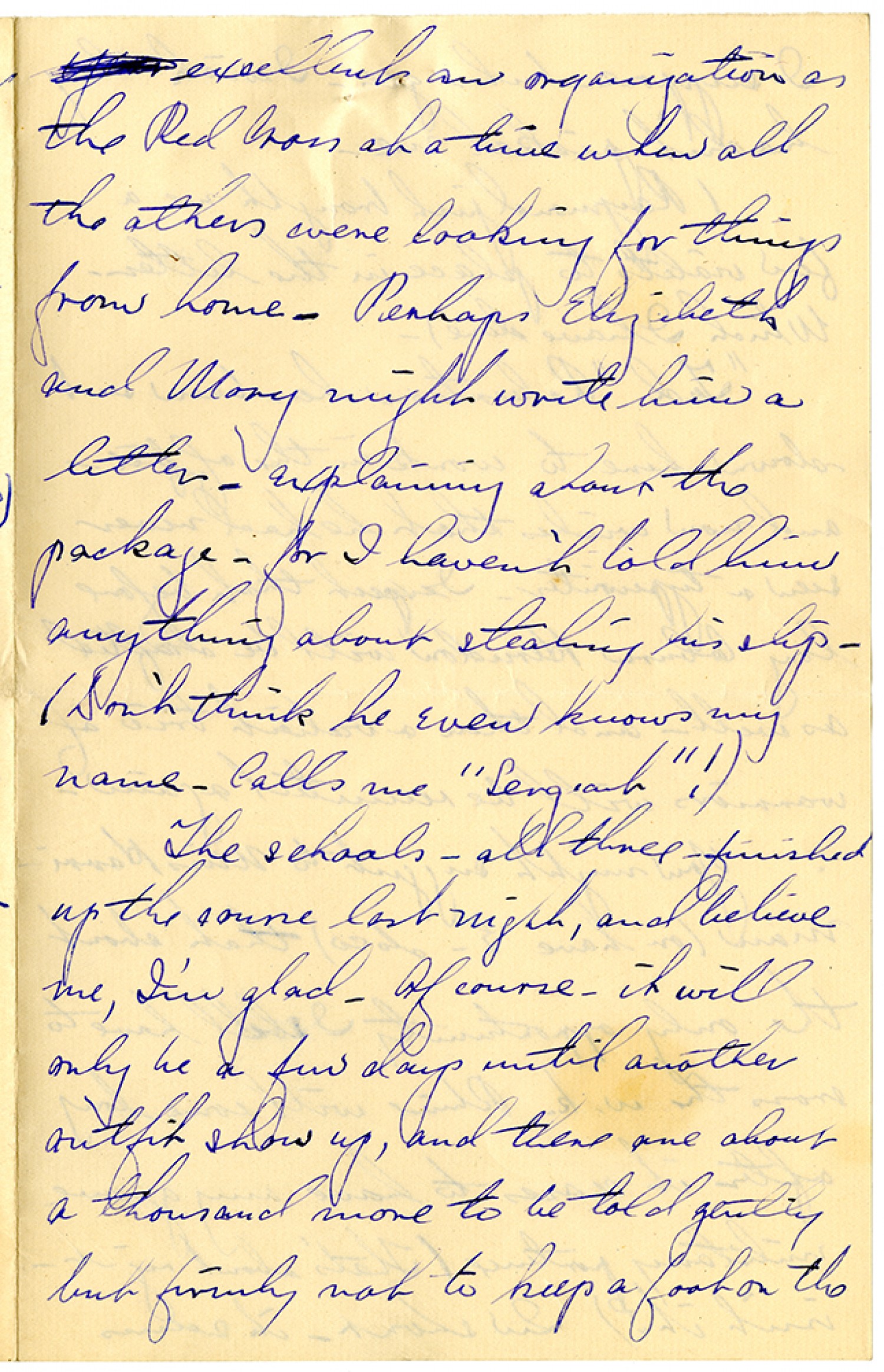 excellent an organization as the Red Cross at a time when all the others were looking for things from home. Perhaps Elizabeth and Mary might write him a letter - explaining about the package - for I haven't told him anything about stealing his slip. (Don't think he even know my name. Calls me "Sergeant"!) The schools - all three - finished up the course last night, and believe me, I'm glad. Of course - it will only be a few days until another outfit show up, and there are about a thousand more to be told gently but firmly not to keep a foot on the