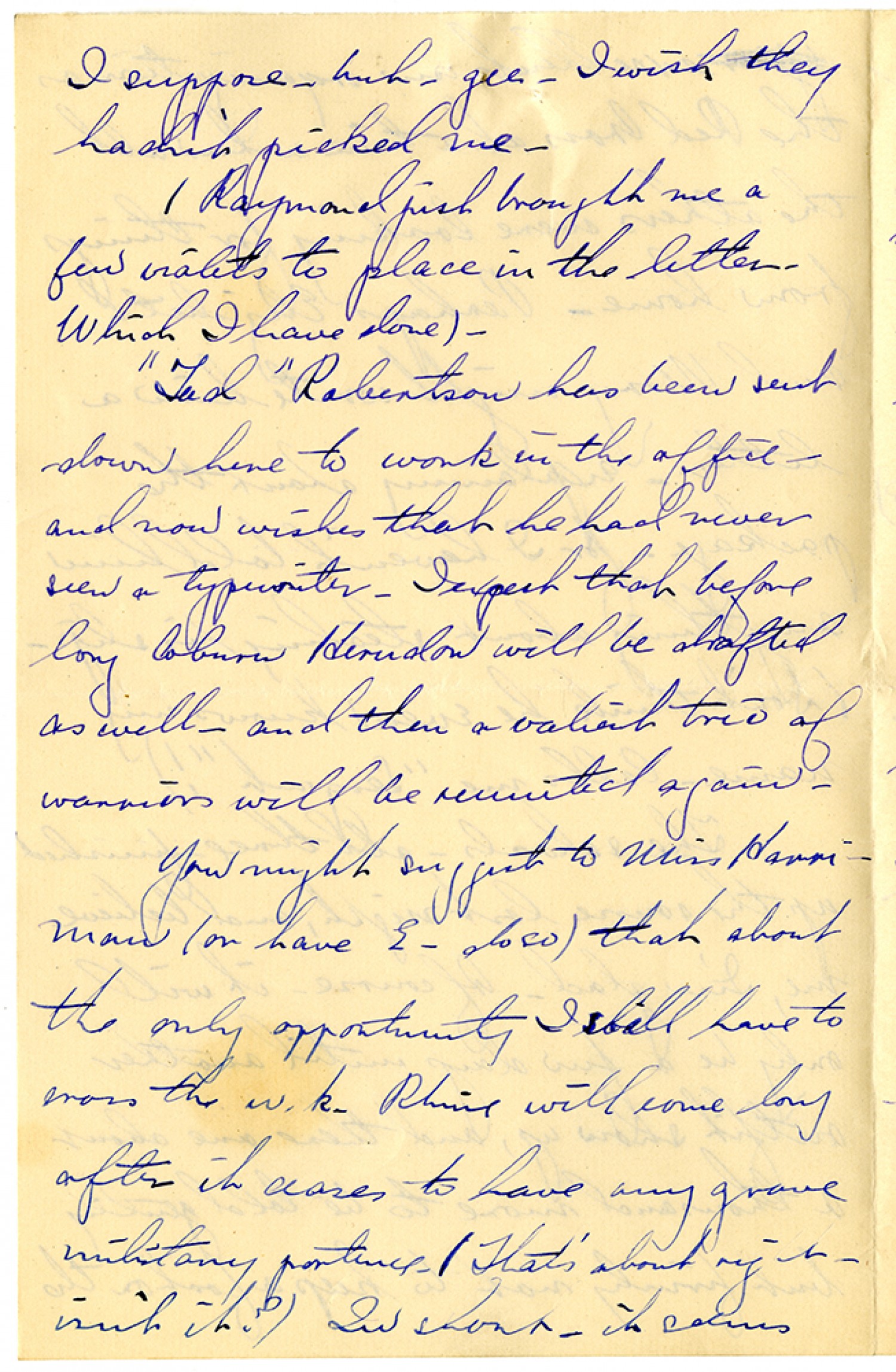 I suppose - but - gee - I wish they hadn't picked me. (Raymond just brought me a few violets to place in the letter - Which I have done). "Tad" Robertson has been sent down here to work in the office - and now wishes that he had never seen a typewriter. I expect that before long Coburn Herndon will be drafted as well - and then a valient trio of warriors will be reunited again. You might suggest to Mrs. Harmman (or have E- do so) that about the only opportunity I still have to cross the w.k. Rhine will come long after it ceases to have any grave military portence. (That's about right - isn't it?) In short - it seems