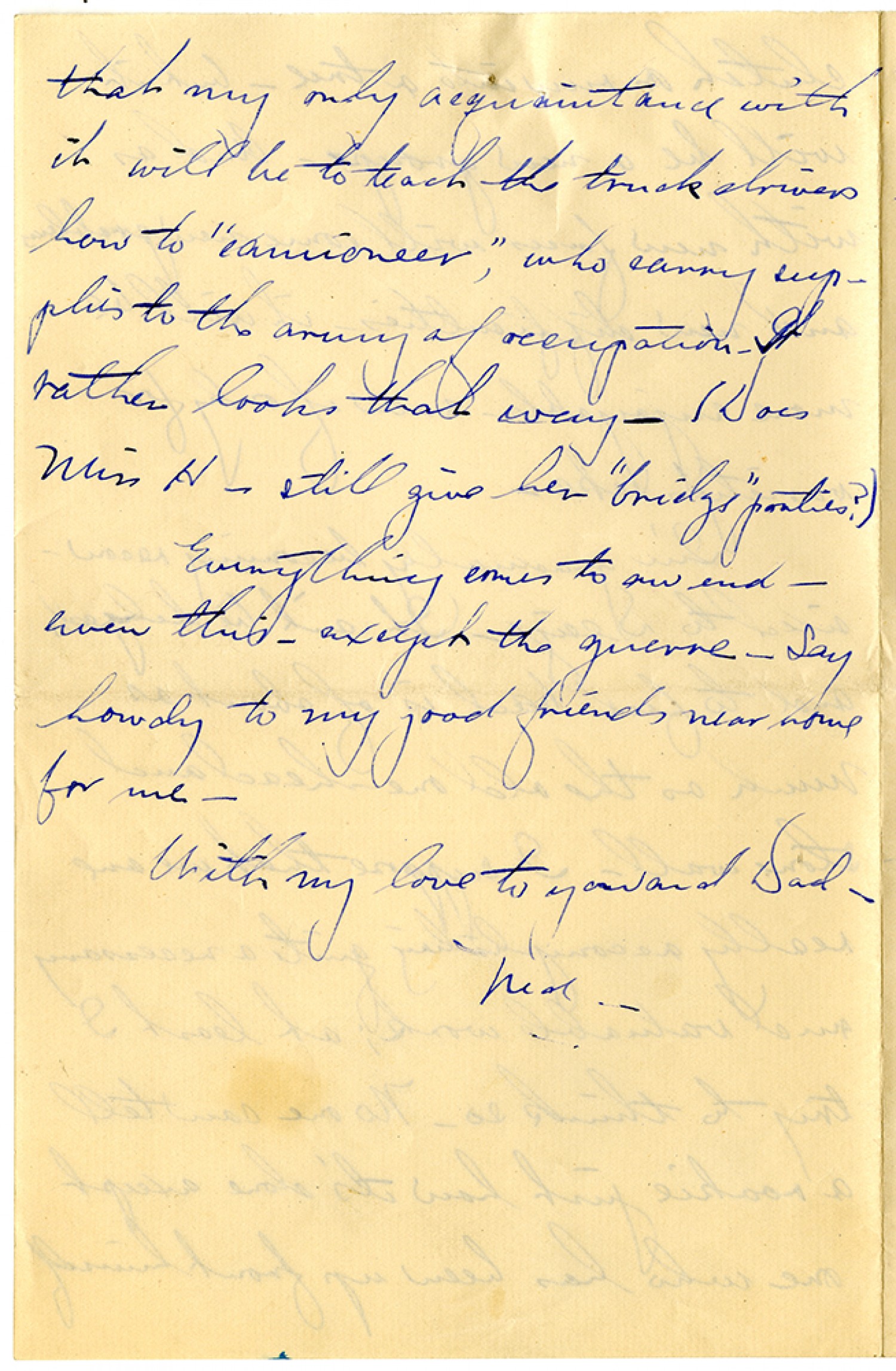 that my only acquaintance with it will be to teach the truck drivers how to "camioneer", who carry supplies to the army of occupation. It rather looks that way - (Does Miss H - still give her "bridge" parties?) Everything comes to an end - even this - except the guerre. Say howdy to my good friends near home for me. With my love to you and Dad. Ned.