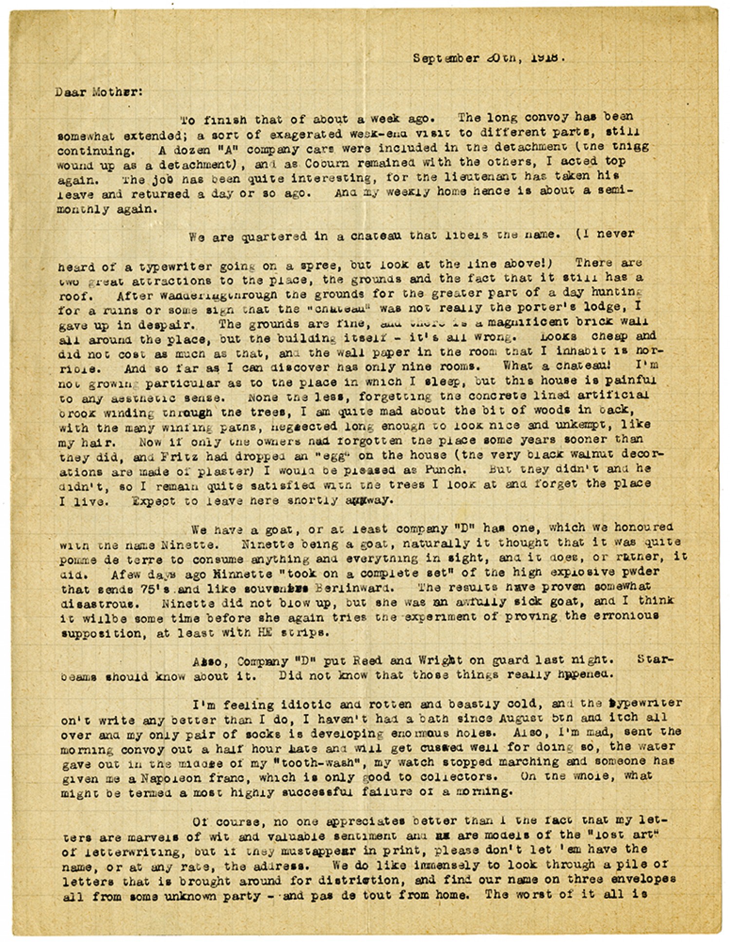 September 20th, 1918. Dear Mother: To finish that of about a week ago. The long convoy has been somewhat extended; a sort of exagerated week-end visit to different parts, still continuing. A dozen "A" company cars were included in the detachment (the thing wound up as a detachment), and as Coburn remained with the others, I acted top again. The job has been quite interesting, for the lieutenant has taken his leave and returned a day or so ago. And my weekly home hence is about a semi-monthly again. We are quartered in a chateau that libels the name (I never heard of a typewriter going on a spree, but look at the line above!) There are two great attractions to the place, the grounds and the fact that it still has a roof. After Wandering through the grounds for the greater part of a day hunting for a ruins or some sign that the "chateau" was not really the porter's lodge, I gave up in despair. The grounds are fine, and there is a magnificent brick wall all around the place, but the building itself - it's all wrong. Looks cheap and did not costs much as that, and the wall paper in the room that I inhabit it horrible. And so far as I can discover has only nine rooms. What a chateau! I'm not growing particular as to the place in which I sleep, but this house is painful to any aesthetic sense. None the less, forgetting the concrete lined artificial brook winding through the trees, I am quite made about the bit of woods in back, with the many winding paths, neglected long enough to look nice and unkempt, like my hair. Now if only the owners had forgotten the place some years sooner than they did, and Fritz had dropped an "egg" on the house (the very black walnut decoration are made of plaster) I would be pleased as Punch. But they didn't and he didn't, so I remain quite satisfied with the trees I look at and forget the place I live. Expect to leave here shortly anyway. We have a goat, or at least company "D" has one, which we honoured with the name Ninette. Ninette being a goat, naturally it thought that it was quite pomme de terre to consume anything and everything in sight, and it does, or rather, it did. A few days ago Ninnette "took on a complete set" of the high explosive pwder that send 75's and like souvenirs Berlinward. The results have proven somewhat disastrous. Ninette did not blow up, but she was an awfully sick goat, and I think it will be some time before she again tried the experiment of proving the erroneous supposition, at least with HE strips. Also, Company "D" put Reed and Wright on guard last night. Starbeams should know about it. Did not know that those things really happened. I'm feeling idiotic and rotten and beastly cold, and the typewriter on't write any better than I do, I haven't had a bath since August 5th an itch all over and my only pair of socks is developing enormous holes. Also, I'm mad, sent the morning convoy out a half hour late and will get cussed well for doing so, the water gave out in the middle of my "tooth-wash", my watch stopped marching and someone has given me a Napoleon franc, which is only good to collectors. On the whole, what might be termed a most highly successful failure of a morning. Of course, no one appreciates better than I the fact that my letters are marvels of wit and valuable sentiment and are models of the "lost art" of letterwriting, but if they must appear in print, please don't let 'em have the name, or at any rate, the address. We do like immensely to look through a pile of letters what is brought around for distriction, and find out name on three envelopes all from some unknown party - and pas de tout from home. The worst of it all is