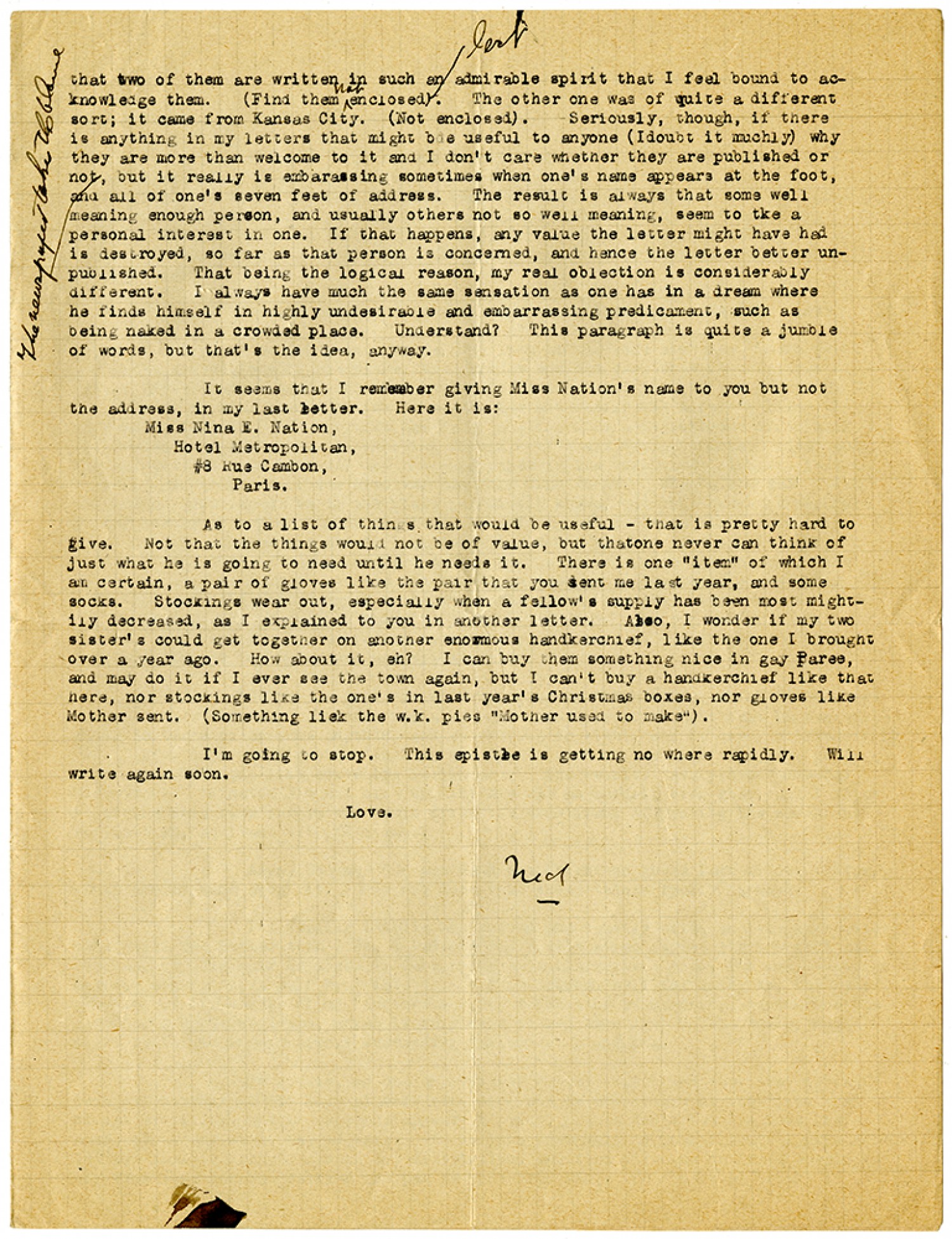 that two of them are written in such an admirable spirit that I feel bound to acknowledge them. (Find them not enclosed) lost The other one was of quite a different sort; it came from Kansas City. (Not enclosed). Seriously, though, if there is anything in my letters that might be useful to anyone (I doubt it muchly) why they are more than welcome to it and I don't care whether they are published or not, The newspaper takes the blame but it really is embarassing sometimes when one's name appears at the foot, and all the of one's seven feet of address. The result is always that some well meaning person, and usually others not so well meaning, seem to the a personal interest in one. If that happens, any value the letter might have had is destroyed, so far as that person is concerned, and hence the letter better unpublished. That being the logical reason, my real objection is considerably different. I always have much the same sensation as one has in a dream where he finds himself in highly undesirable and embarrassing predicament, such as being naked in a crowded place. Understand? This paragraph is quite a jumble or words, but that's the idea, anyway. It seems that I remember giving Miss Nation's name to you but not the address, in my last letter. Here it is: Miss Nina E. Nation, Hotel Metropolitan, #8 Rue Cambon, Paris. As to a list of things that would be useful - that is pretty hard to give. Not that the things would not be of value, but that one never can think of just what he is going to need until he needs it. There is one "item" of which I am certain, a pair of gloves like the pair that you sent me last year, and some socks. Stockings wear out, especially when a fellow's supply has been most mightily decreased, as I explained to you in another letter. Also, I wonder if my two sister's could get together on another enormous handkerchief, like the one I brought over a year ago. How about it, eh? I can buy them something nice in gay Paree, and may do it if I ever see the town again, but I can't buy a handkerchief like that here, nor stockings like the one's in last year's Christmas boxes, nor gloves like Mother sent. (Something like the w.k. pies "Mother used to make"). I'm going to stop. This epistle is getting no where rapidly. Will write again soon. Love. Ned