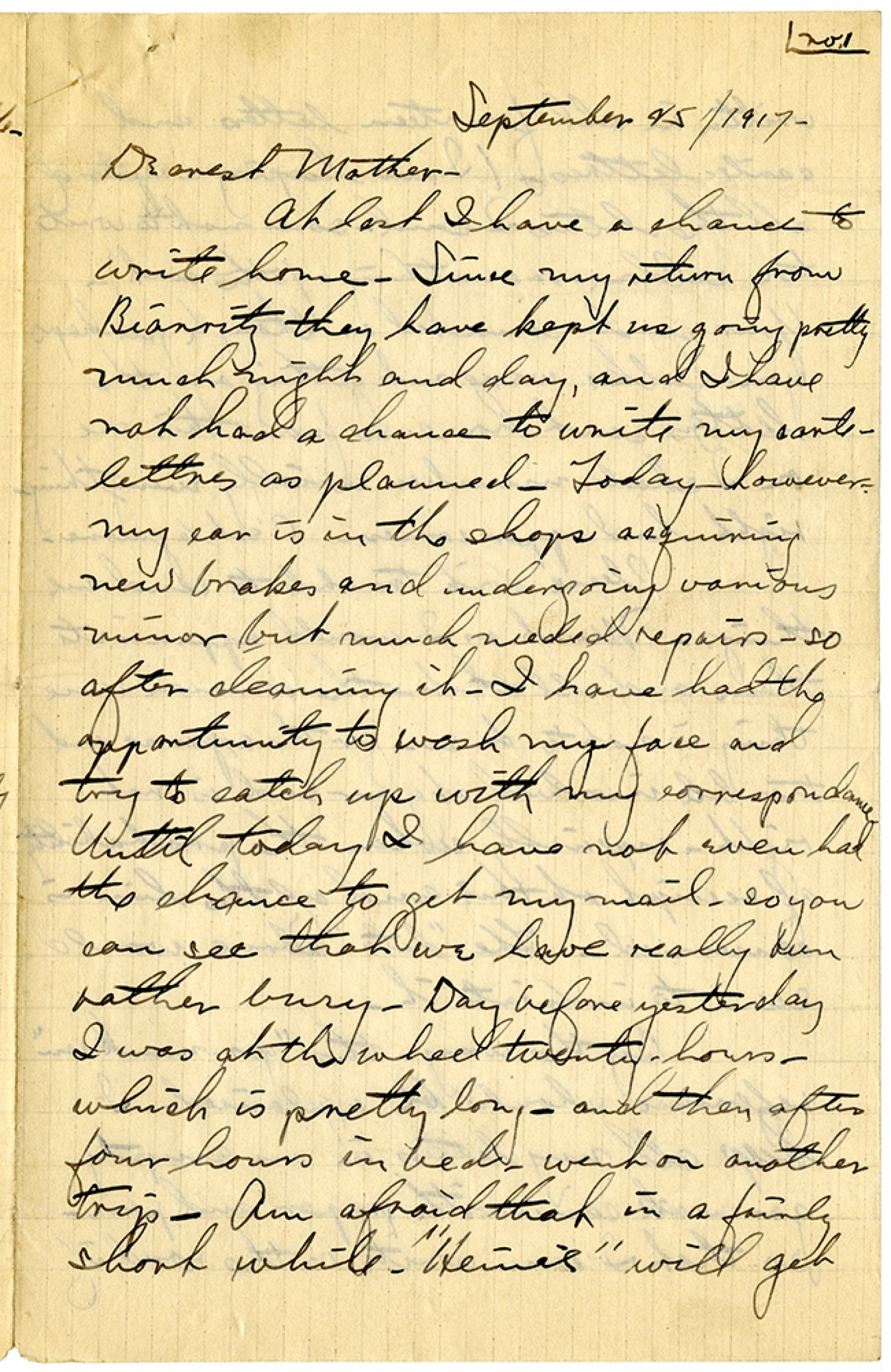 no. 1 September 25/1917 - Dearest Mother- At last I have a chance to write home. Since my return from Biarritz they have kept us going pretty much night and day, and I have not had a chance to write my carte-lettres as planned. Today - however my car in the shops acquiring new brakes and undergoing various minor but much needed repairs - so after cleaning it. I have had the opportunity to wash my face and try to catch up with my correspondence. Until today I have not even had the chance to get my mail - so you can see that we have really been rather busy. Day before yesterday I was at the wheel twenty hours - which is pretty long - and then after four hours in bed - went on another trip. Am afraid that in a fairly short while - "Heine" will get