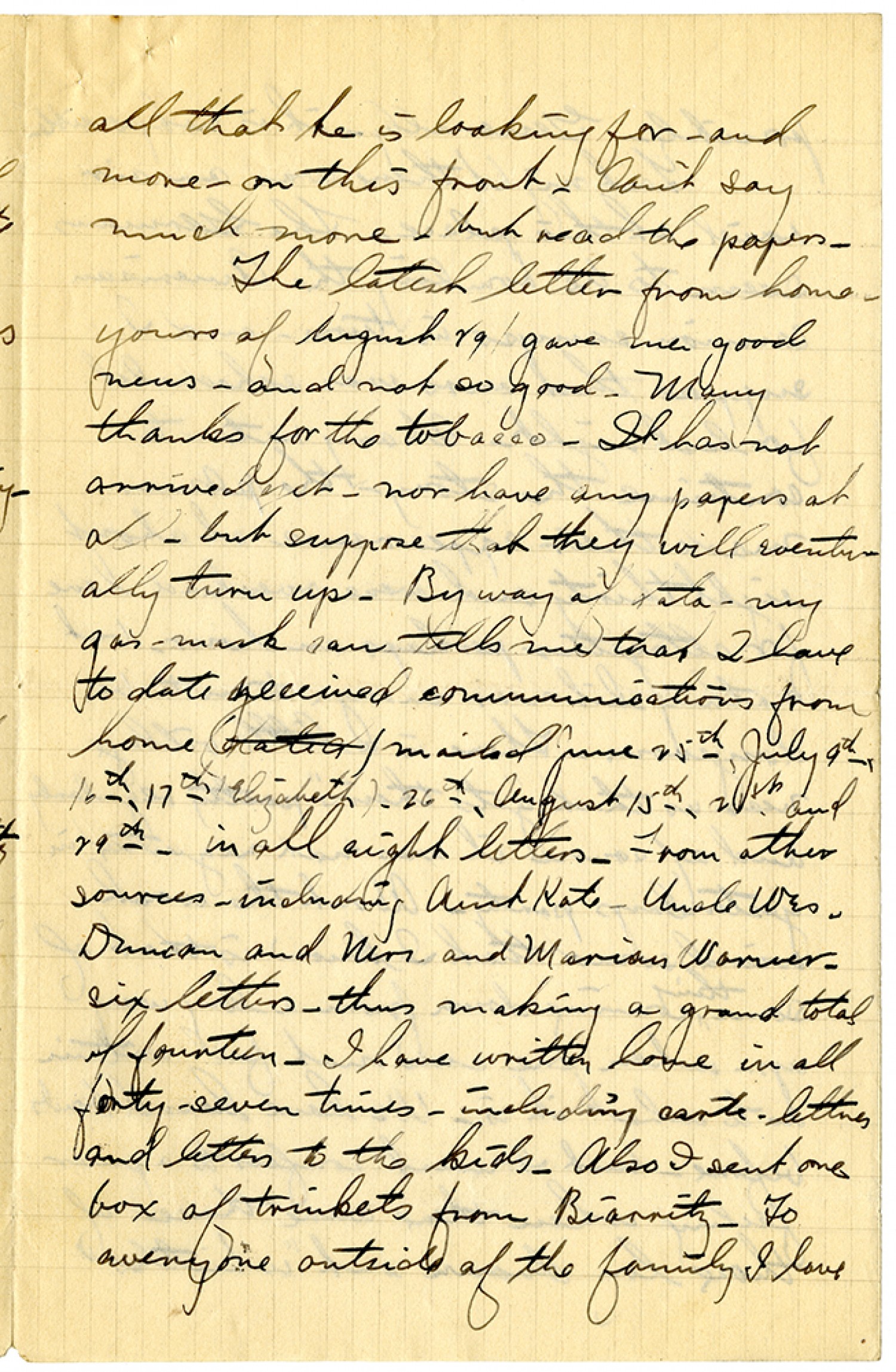 all that he is looking for - and more - on this front. Can't say much more - but read the papers. The latest letter from home - yours of August 29 gave me good news - not so good. Many thanks for the tobacco. It has not arrived yet - nor have any papers at all - but suppose that they will eventually turn up. By way of data - my gas-mask can tells me that I have to date received communications from home (mailed June 25th, July 9th, 16th, 17th Elizabeth) - 26th, August 15th, 21st and 29th - in all eight letters. From other sources - including Aunt Kate - Uncle Wes, Duncan and Mrs. and Marian Warner - six letters - thus making a grand total of fourteen. I have written home in all forty-seven times - including carte-lettres and letters to the kids. Also I sent one box of trinkets from Biarritz. To everyone outside of the family I have