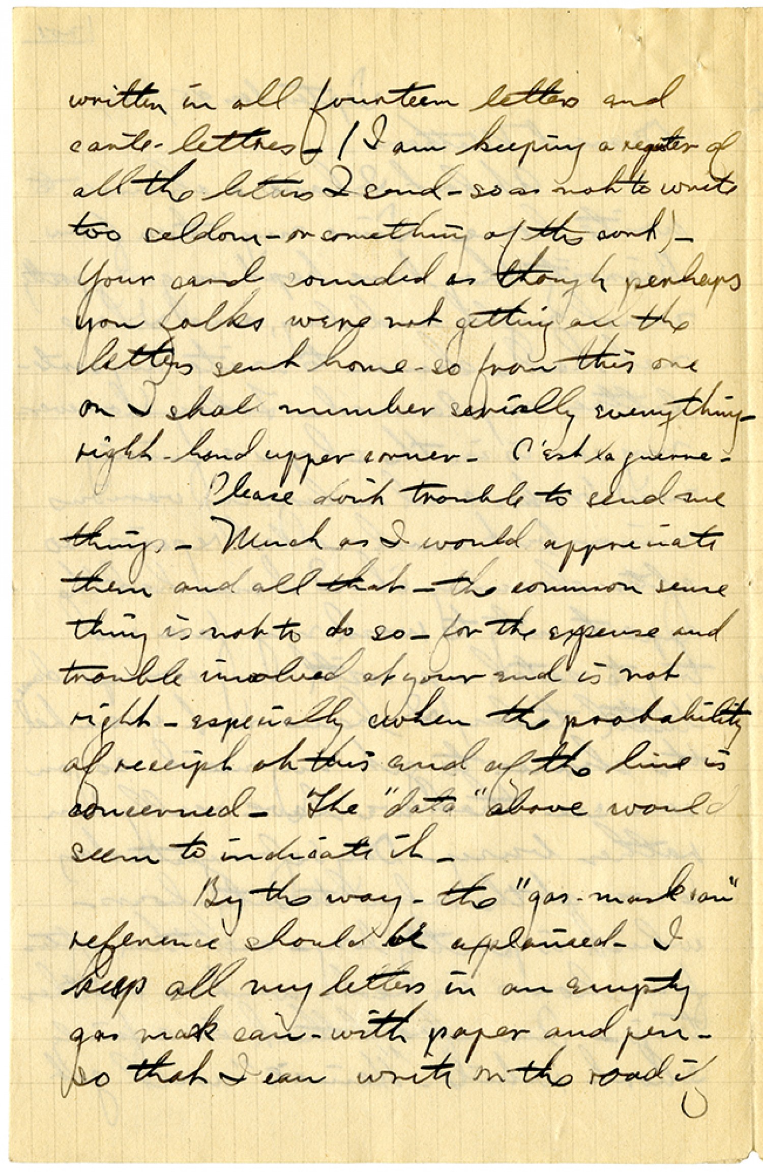 written in all fourteen letters and carte-lettres. (I am keeping a register of all the letters I send - so as not to write too seldom - or something of this sort). Your card sounded as though perhaps you folks were not getting all the letters sent home - so from this one on I shall number serially everything - right-hand upper corner. C'est la guerre. Please don't trouble to send me things. Much as I would appreciate them and all that - the common sense thing is not to do so - for the expense and trouble involved at your end is not right - especially when the probability of receipt at this and of the line is concerned. The "data" above would seem to indicate it. By the way - the "gas-mask can" reference should be explained. I keep all my letters in an empty gas mask can - with paper and pen - so that I can write on the road if