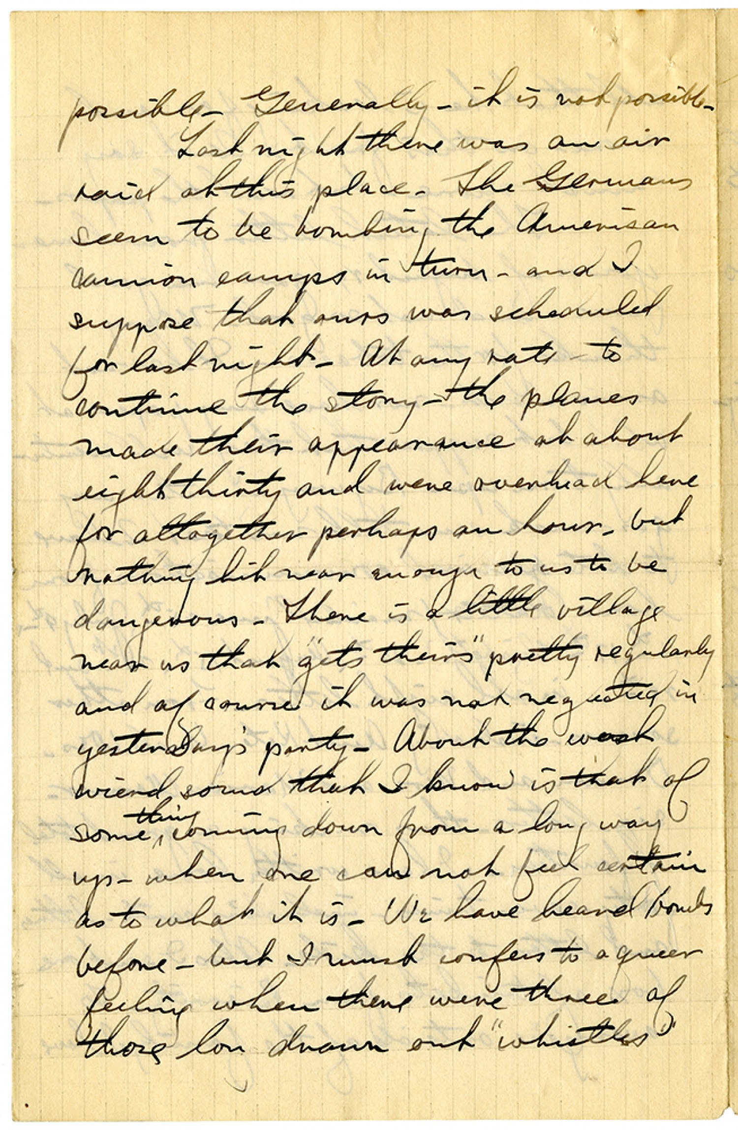 possible. Generally - it is not possible. Last night there was an air raid at this place. The Germans seem to be bombing the American camion camps in turn - and I suppose that ours was scheduled for last night. At any rate - to continue the story - the planes made their appearance at about eight thirty and were overhead here for altogether perhaps an hour - but nothing hit near enough to us to be dangerous. There is a little village near us that "gets theirs" pretty regularly and of course it was not neglected in yesterday's party. About the worst wierd sound that I know is that of some thing coming down from a long way up - when one can not feel certain as to what it is. We have heard bombs before - but I must confess to a queer feeling when there were three of those long drawn out "whistles"