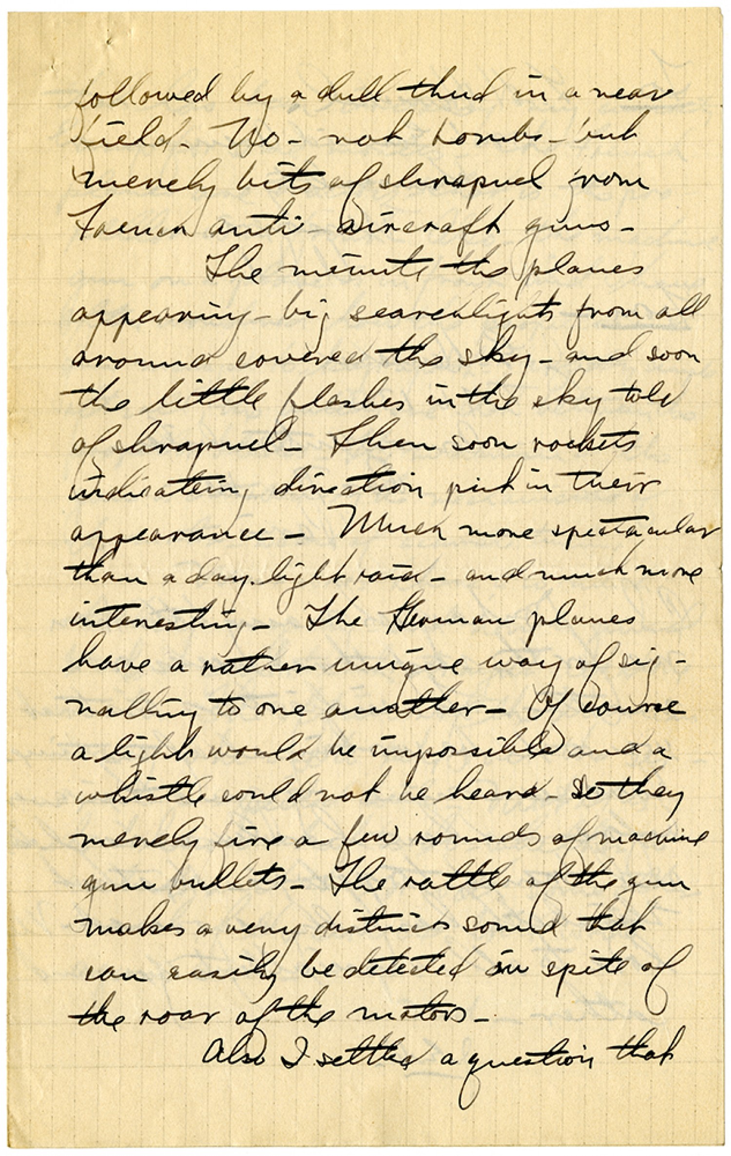 followed by a full thud in a near field. No - not bombs - but merely bits of shrapnel from French anti-aircraft guns. The minute the planes appearing - big searchlights from all around covered the sky - and soon the little flashes in the sky told of shrapnel. Then soon rockets indicating direction put in their appearance. Much more spectacular than a day light raid - and much more interesting. The German planes have a rather unique way of signalling to one another. Of course a light would be impossible and a whistle would not be heard - so they merely fire a few rounds of machine gun bullets. The rattle of the gun makes a very distinct sound that can easily be detected in spite of the roar of the motors. Also I settled a question that