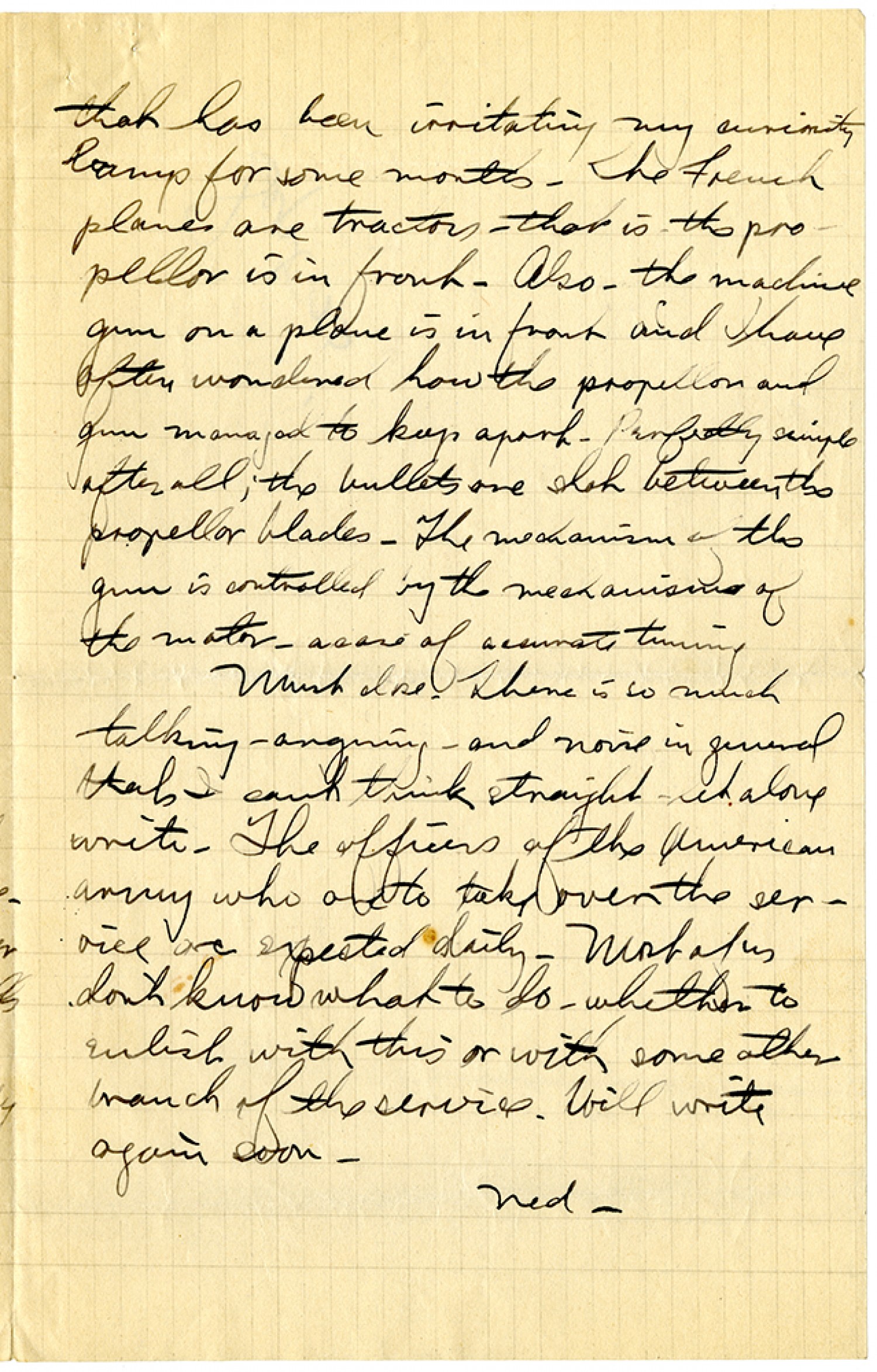 that has been irritating my curiosity lamp for some months. The French planes are tractors - that is the propellor is in front. Also - the machine gun on a plane is in front and I have often wondered how the propellor and gun managed to keep apart. Perfectly simple after all; the bullets are shot between the propellor blades. The mechanism of the gun is controlled by the mechanisms of the motor - a case of accurate timing. Must close. There is so much talking-arguing - and noise in general that I can't think straight - let along write. The officers of the American army who are to take over the service are expected daily. Most of us don't know what to do - whether to enlist with this or with some other branch of the service. Will write again soon. Ned.