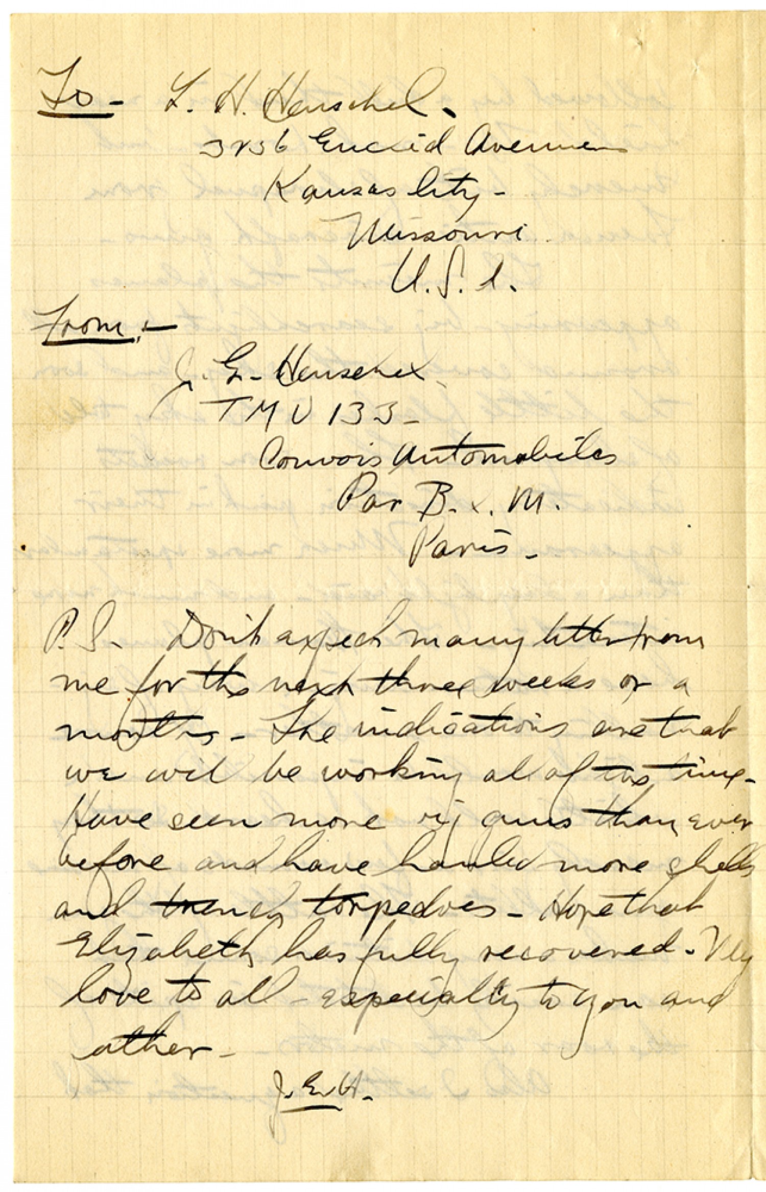 To - L.H. Henschel 3236 Euclid Avenue Kansas City - Missouri U.S.A. From - J.E. Henschel TMU 133 - Convois Automobiles Par B.C.M. Paris. P.S. Don't expect many letters from for the next three weeks or a month. The indications are that we will be working all of the time. Have seen more big guns than ever before and have handled more shells and trench torpedoes. Hope that Elizabeth has fully recovered. My love to all - especially to you and father. J.E.H.