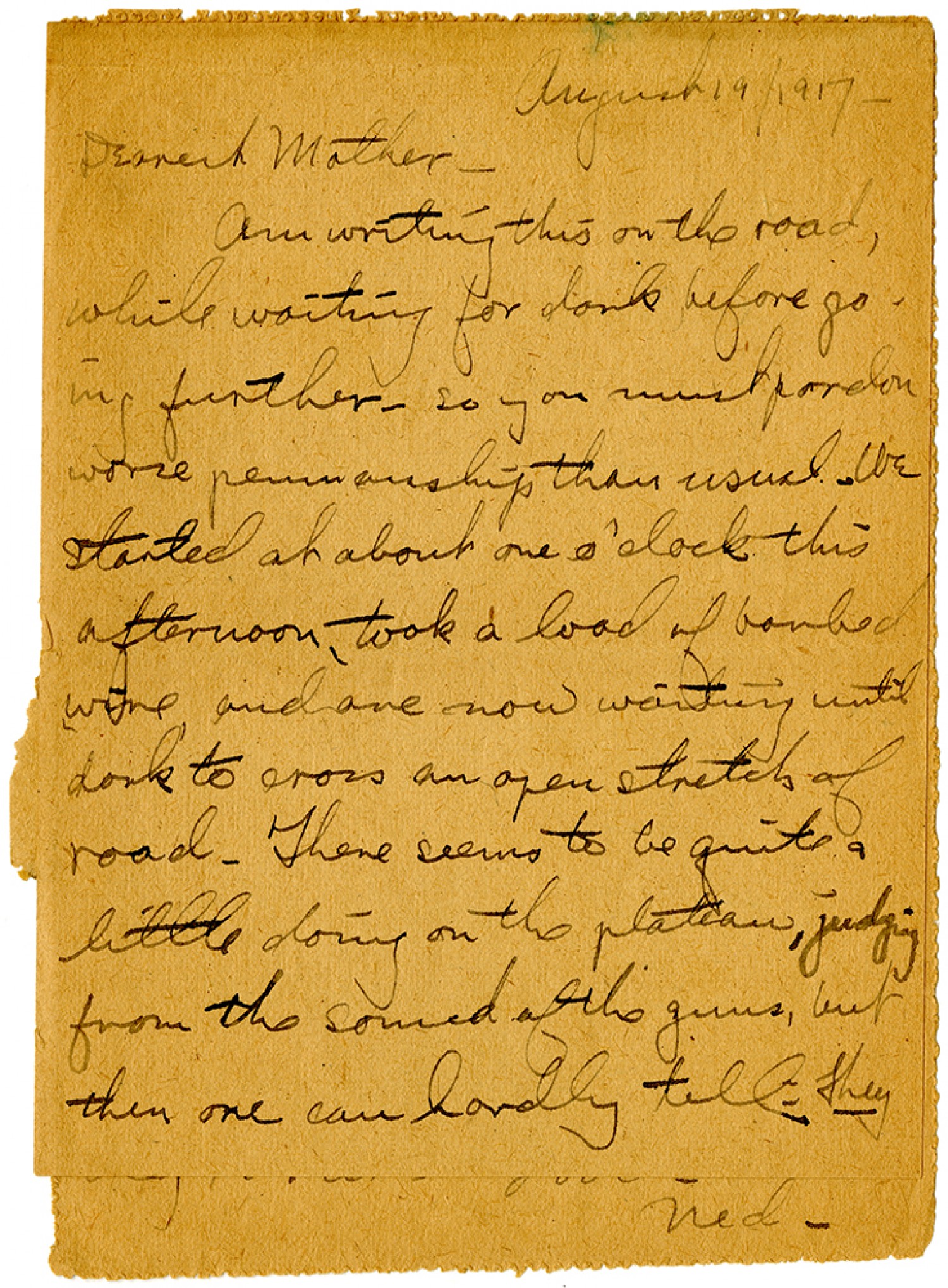 August 19 1917 - Dearest Mother- Am writing this on the road, while waiting for dark before going further - so you must pardon worse penmanship than usual. We started at about one o'clock this afternoon, took a load of barbed wire, and are now waiting until dark to cross an open stretch of road. There seems to be quite a little doing on the plateau, judging from the sound of the guns, but then one can hardly tell. They