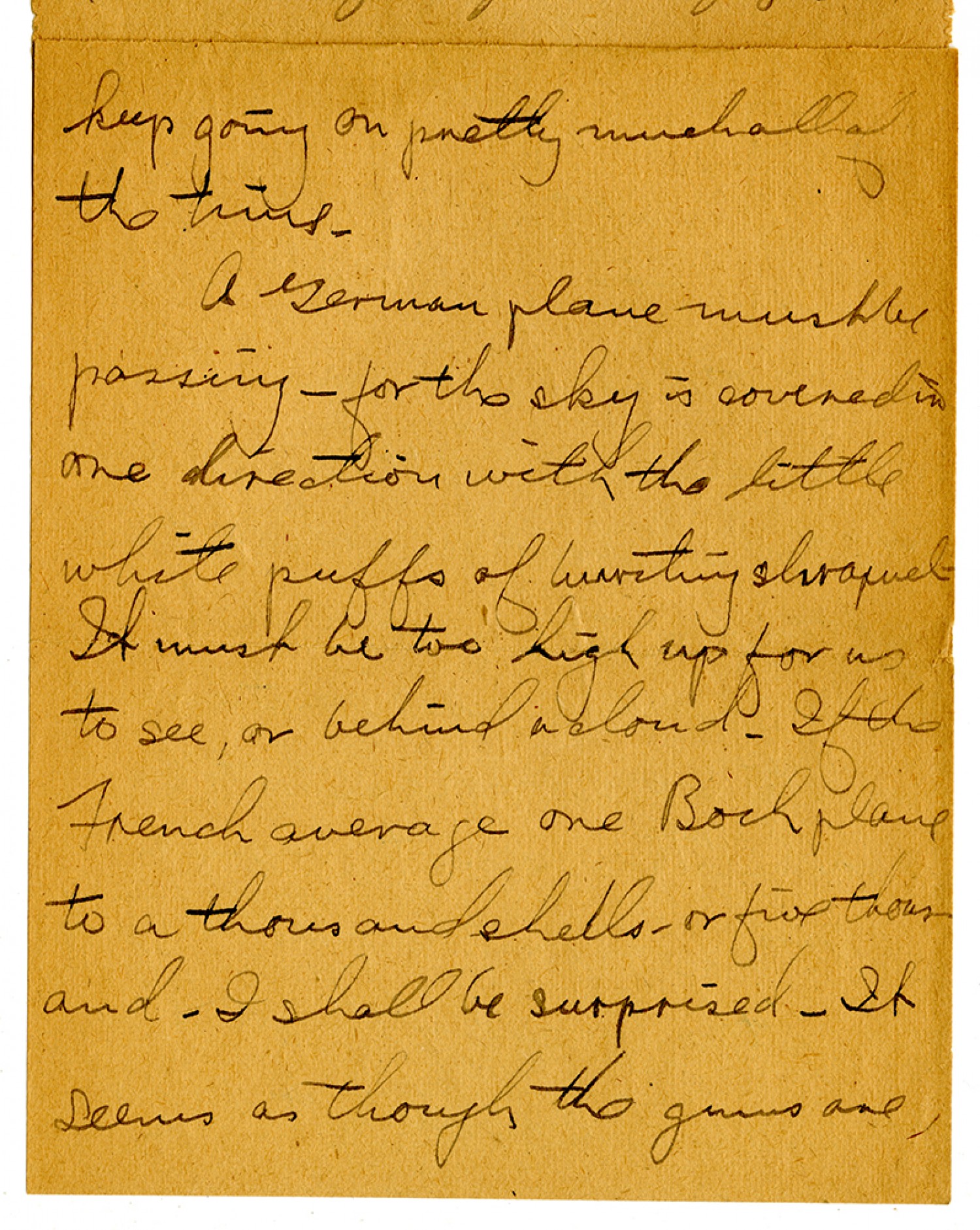 keep going on pretty much all of the time. A German plane must be passing - for the sky is covered in one direction with the little white puffs of bursting shrapnel. It must be too high up for us to see, or behind a cloud. If the French average one Boch plane to a thousand shells - or five thousand - I shall be surprised. It seems as though the guns are
