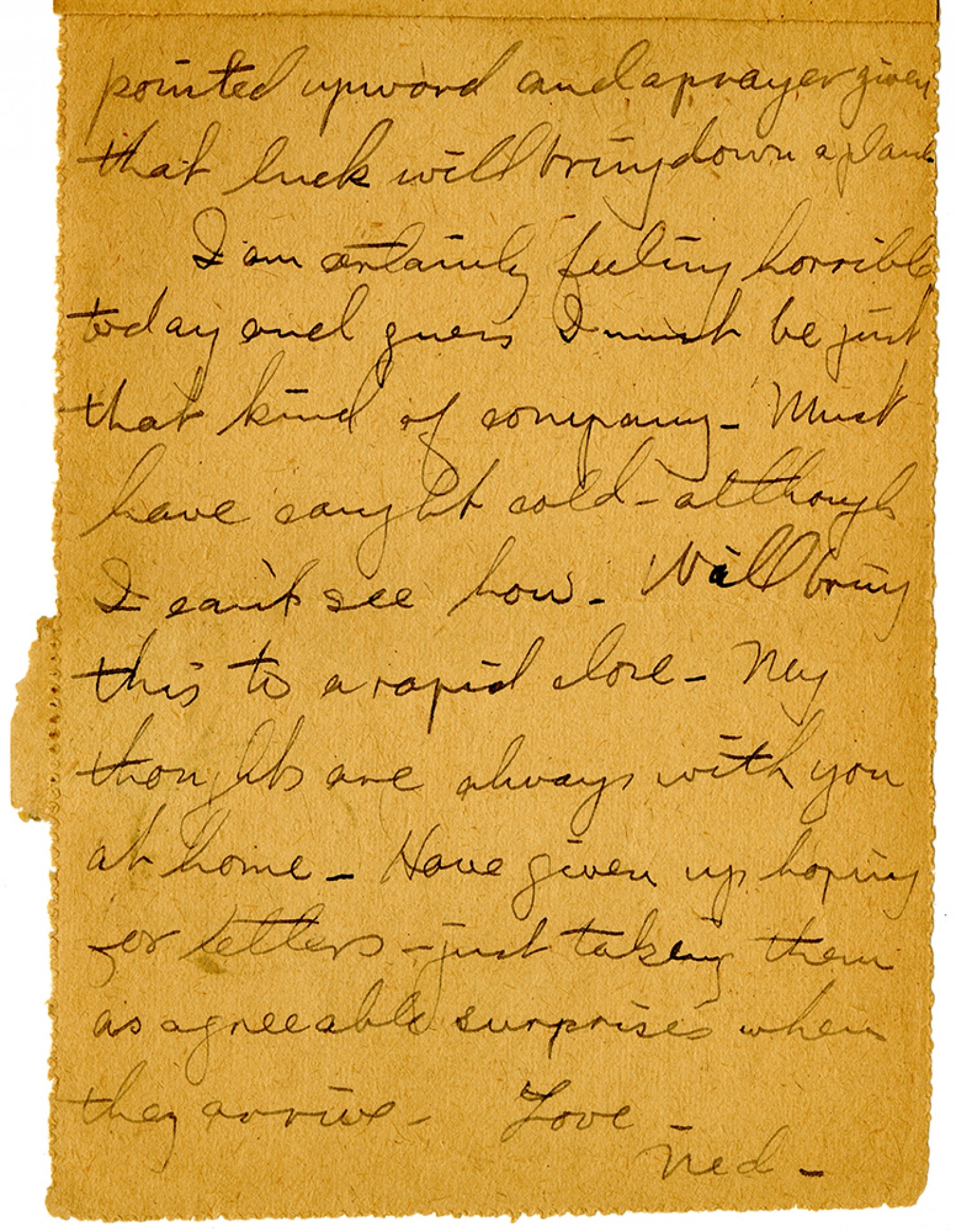 pointed upward and a prayer given that luck will bring down a plane. I am certainly feeling horrible today and guess I must be just that kind of company. Must have caught cold - although I can't see how. Will bring this to a rapid close. My thoughts are always with you at home. Have given up hoping for letters - just taking them as agreeable surprises when they arrive. Love - Ned.
