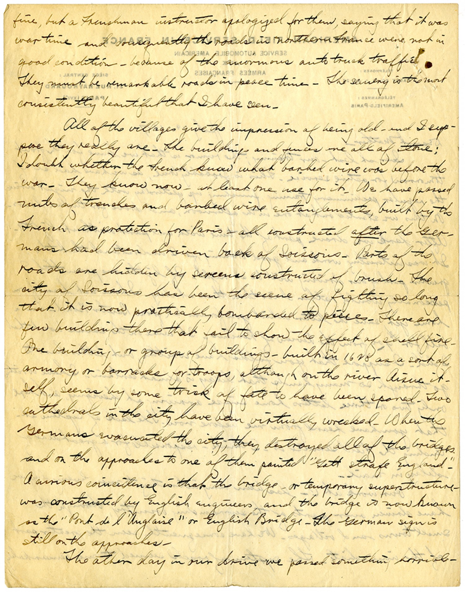 fine, but a Frenchman instructor apologized for them, saying that it was war time and consequently the roads in Northern France were not in good condition - because of the enormous auto truck traffic. They must be remarkable roads in peace time. The scenery is the most consistently beautiful that I have seen. All of the villages give the impression of being old - and I suppose they really are. The buildings and fences are all of stone; I doubt whether the French know what barbed wire was before the war. They know now - at least the use for it. We have passed miles of trenches and barbed wire entanglements, built by the French as protection for Paris - all constructed after the Germans had been driven back of Soissons. Parts of the roads are hidden by screens constructed of brush. The city of Soissons has been the scene of fighting so long that it is now practically bombarded to pieces. There are few buildings there that fail to show the effect of shell fire. One building - or group of buildings - built in 1620 as a sort of armory or barracks for troops, although on the river Aisne itself, seems by trisk of fate to have been spared. Two cathedrals in the city have been virtually wrecked. When the Germans evacuated the city, they destroyed all of the bridges, and on the approaches to one of them painted "Gott strafe England". A curious coincidence is that the bridge - or temporary superstructure - was constructed by English engineers and the bridge is now known as the "Port de l'Anglaise" or English Bridge. The German sign is still on the approaches. The other day in our drive we passed something horrible -