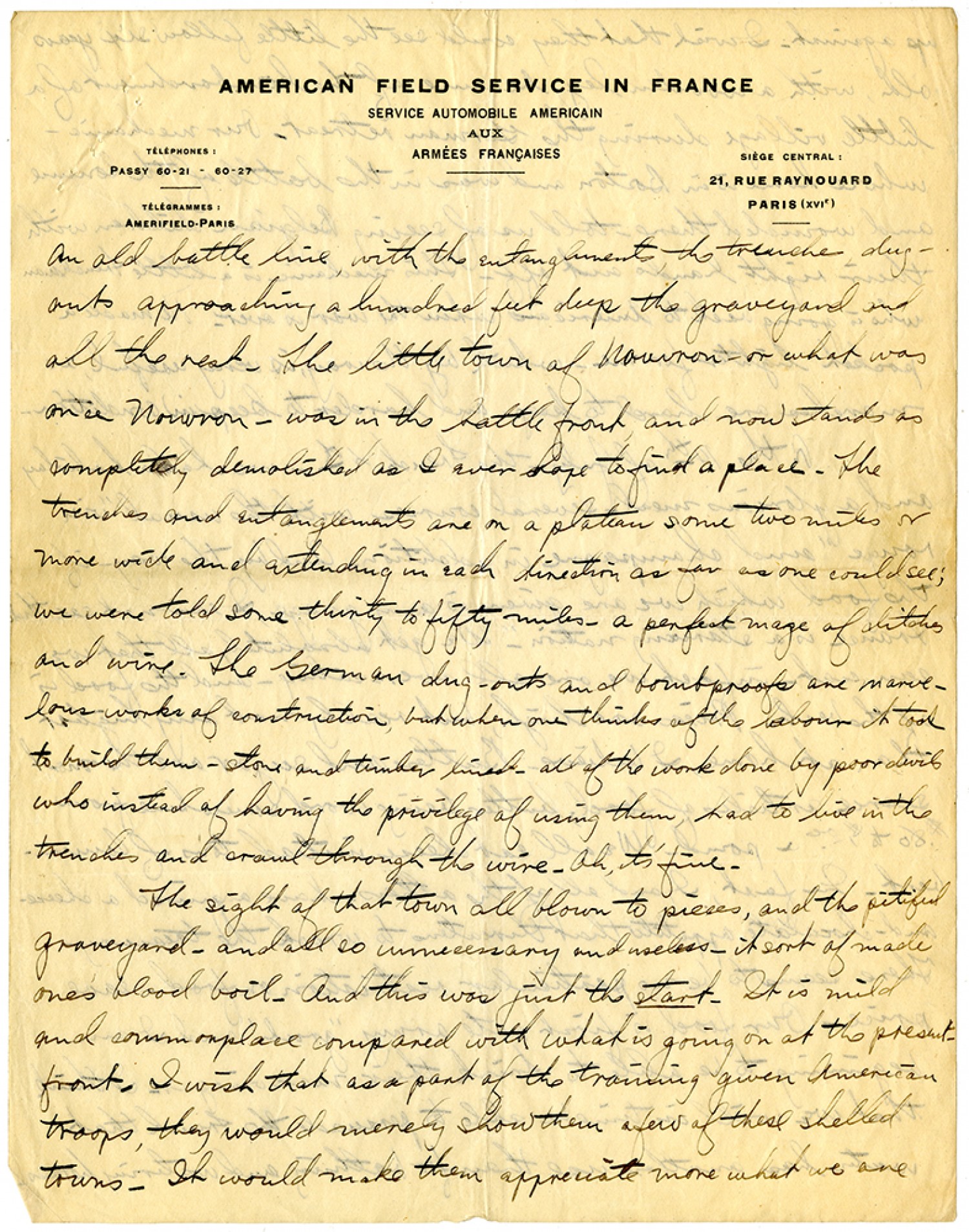 an old battle line, with the entanglements, the trenches dugouts approaching a hundred feet deep the graveyard and all the rest. The little town of Nouvron - or what was once Nouvron - was in the battle front, and now stands as completely demolished as I ever hope to find a place. The trenches and entanglements are on a plateau some two miles or more wide and extending in each direction as far as one could see; we were told some thirty to fifty miles - a perfect maze of ditches and wire. The German dug-outs and bombproofs are marvelous works of construction, but when one thinks of the labour it took to build them - stone and timber lined - all of the work done by poor devils who instead of having the privilege of using them, had to live in the trenches and crawl through the wire. Oh, it's fine. The sight of that town all blown to pieces, and the pitiful graveyard - and all so unnecessary and useless - it sort of made ones blood boil. And this was just the start. It is mild and commonplace compared with what is going on at the present front. I wish that as a part of the training given American troops, they would merely show them a few of these shelled towns. It would make them appreciate more what we are