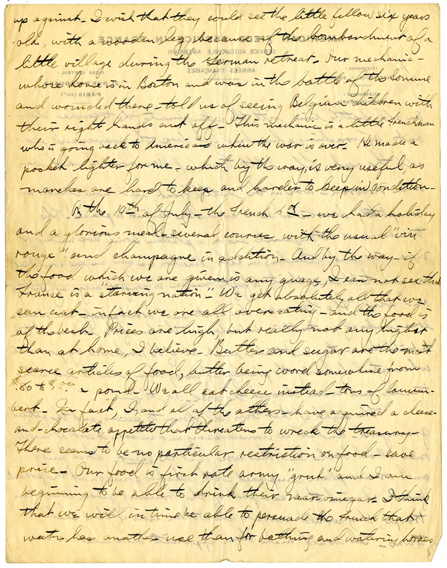 up against. I wish that they would see the little fellow six years old, with a wooden leg, because of the bombardment of a little village during the German retreat. Our mechanic - whose home is in Boston and was in the battle of the Somme and wounded there - told us of seeing Belgian children with their right hands cut off. This mechanic is a little Frenchman who is going back to America when the war is over. He made a pocket light for me - which by the way, is very useful, as matches are hard to keep and harder to keep in condition. On the 14th of July - the French 4th - we had a holiday and a glorious meal - several courses, with the usual "vin rouge" and champagne in addition. And by the way - if the food which we are given is any gauge, I can not see that France is a "starving nation". We get absolutely all that we can eat - in fact we are all over-eating - and the food is of the best. Prices are high, but really not any higher than at home, I believe. Butter and sugar are the most scarce articles of food, butter being word somewhere from $.80 to $1.00 a pound. We all eat cheese instead - tons of Camembert. In fact, I, and all of the others - have acquired a cheese-and-chocolate appetite that threatens to wreck the treasury. There seems to be no particular restriction on food - save price. Our food is first rate army "grub" and I am beginning to be able to drink their near-vinegar. I think that we will in time be able to persuade the French that water has another use than for bathing and watering horses