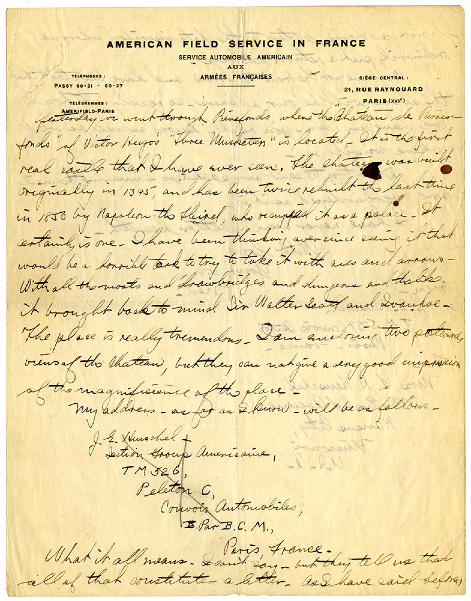 Yesterday we went through [Pierrefonds], where the "Chateau de [Pierrefonds]" of Victor Hugo's "Three Musketeers" is located. It is the first real castle that I have ever seen. The Chateau was built originally in 1395, and has been twice rebuilt the last time in 1850 by Napoleon the Third, who occuppied it as a palace. It certainly is one. I have been thinking ever since seeing it that would be a horrible task to try to take it with axes and arrows. With all the moats and drawbridges and dungeons and the like, it brought back to mind Sir Walter Scott and Ivanhoe. The place is really tremendous. I am enclosing two postcard views of the Chateau, but they can not give a very good impression of the magnificence of the place. My address - as far as I know - will be as follows. J.E. Henschel - Section Group Americaine, TM 526, Peleton C, Convois Automobiles, Par B.C.M., Paris, France. What it all means - I can't say - but they tell us that all of that constitutes a letter. As I have said before