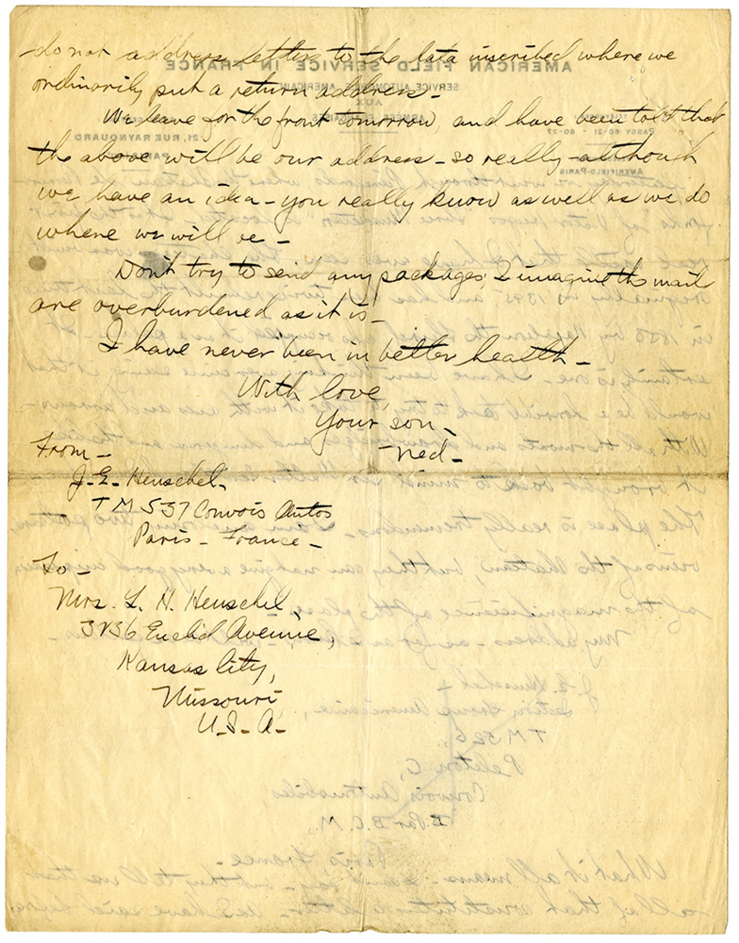 do not address letters to the data inscribed where we ordinarily put a return address. We leave for the front tomorrow and have been told that the above will be our address - so really although we have an idea - you really know as well as we do where we will be. Don't try to send any packages; I imagine the mails are overburdened as it is. I have never been in better health. With love, Your son - Ned. From - J.E. Henschel, TM 537 Convois Autos Paris, France. To - Mrs. L.H. Henschel 3236 Euclid Avenue, Kansas City, Missouri U.S.A.