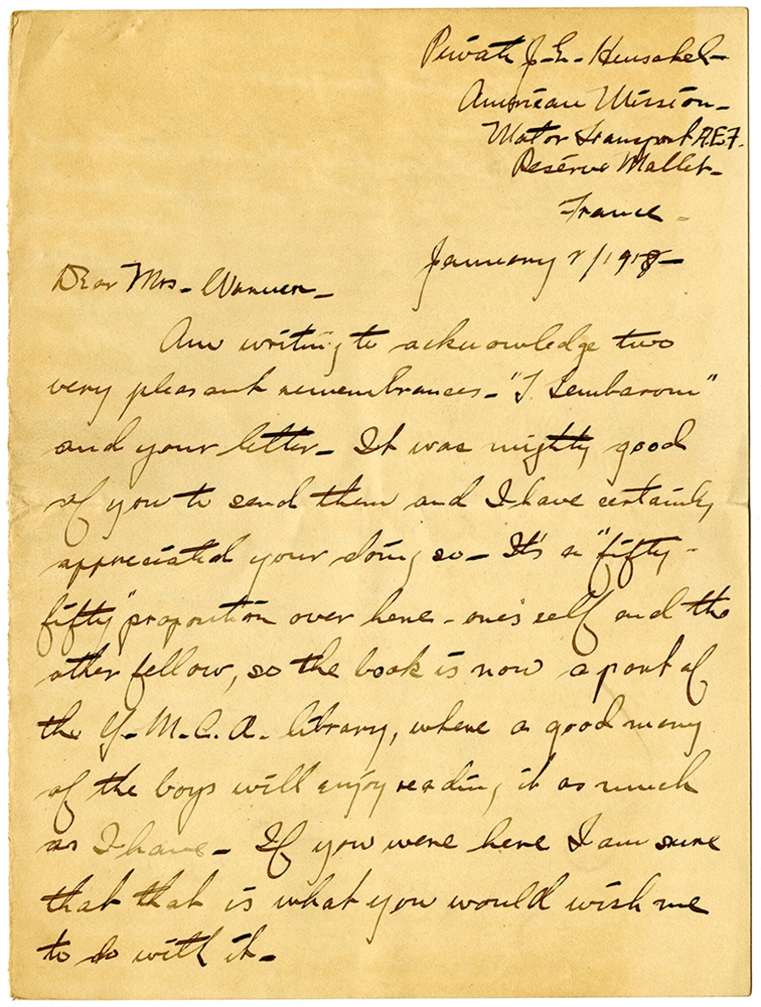 Private J.E. Henschel - American Mission - Motor Transport A.E.F. Reserve Mallet - France - January 2/1918 - Dear Mrs. Warner - Am writing to acknowledge two very pleasant remembrances - "T Lembarom" and your letter. It was mighty good of you to send them and I have certainly appreciated your doing so. It's a “fifty-fifty" proposition over here - one's self and the other fellow, so the book is now a part of the Y.M.C.A. library, where a good many of the boys will enjoy reading it as much as I have. If you were here I am sure that that is what you would wish me to do with it.