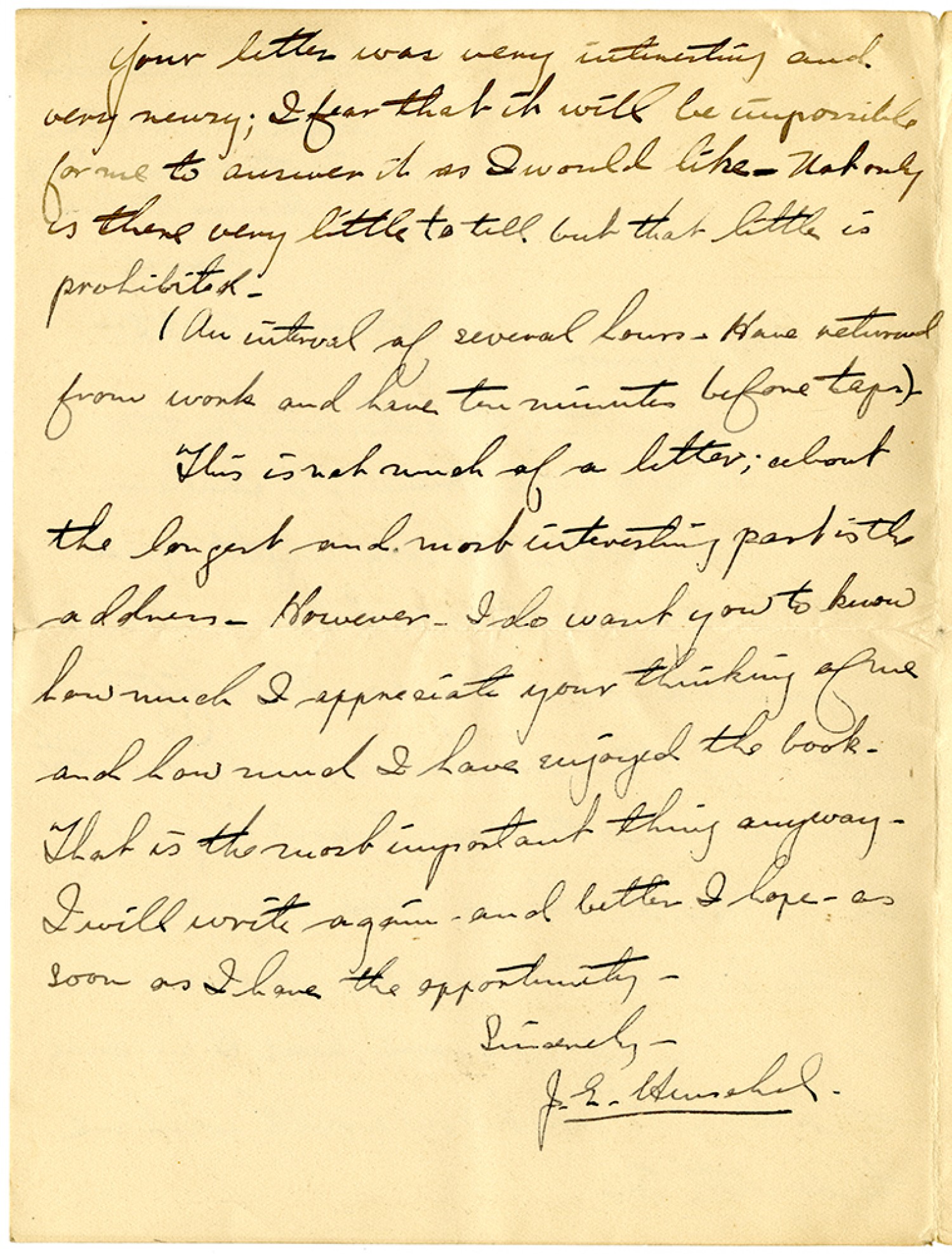 Your letter was very interesting and very newsy; I fear that it will be impossible for me to answer it as I would like. Not only is there very little to tell but that little is prohibited. (An interval of several hours. Have returned from work and have ten minutes before taps). This is not much a letter; about the longest and most interesting part is the address. However - I do want you to know how much I appreciate your thinking of me and how much I have enjoyed the book. That is the most important thing anyway. I will write again and better I hope - as soon as I have the opportunity. Sincerely - J.E. Henschel.
