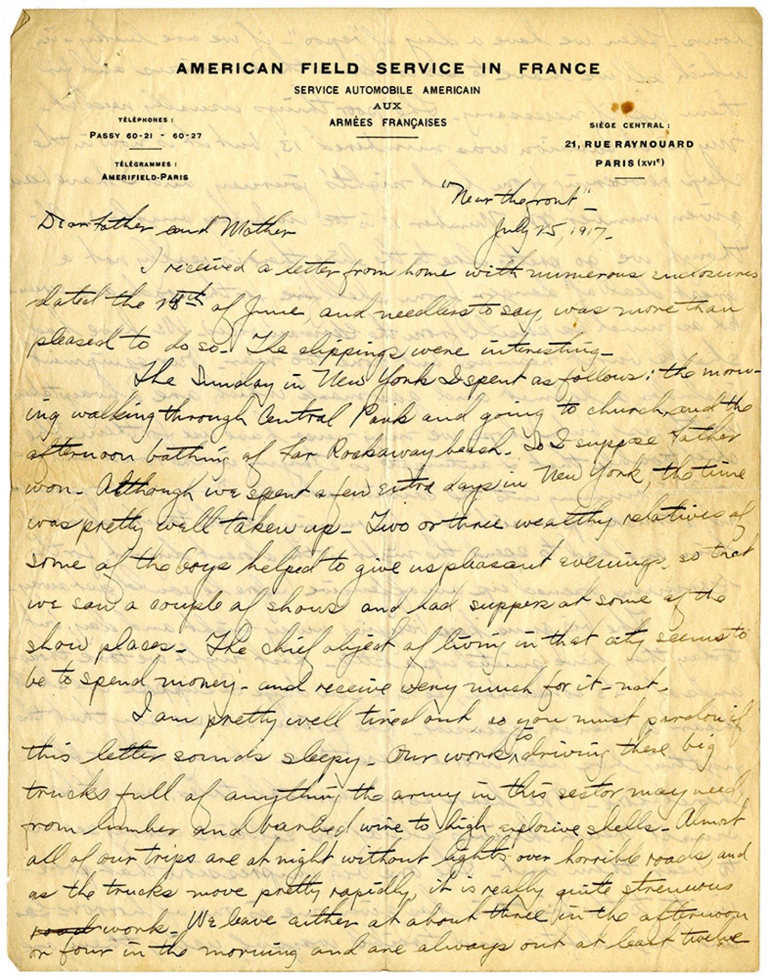 "Near the front" - July 25, 1917 - Dear Father and Mother I received a letter from home with numerous enclosures dated the 24th of June, and needless to say, was more than pleased do so. The clippings were interesting. The Sunday in New York I spent as follows: the morning walking through Central Park and going to church, and the afternoon bathing af Far Rockaway beach. So I suppose Father won. Although we spent a few extra days in New York, the time was pretty well taken up. Two or three wealthy relatives of some of the boys helped to give us pleasant evenings so that we saw a couple of shows and had suppers at some of the show places. The chief object of living in that city seems to be to spend money - and receive very much for it - not. I am pretty well tired out, so you must pardon if this letter sounds sleepy. Our work is driving these big trucks full of anything the army in this sector may need from lumber and barbed wire to high explosive shells. Almost all of our trips are at night without lights over horrible roads, and as the trucks move pretty rapidly, it is really quite strenuous work. We leave either at about three in the afternoon or four in the morning and are always out at least twelve