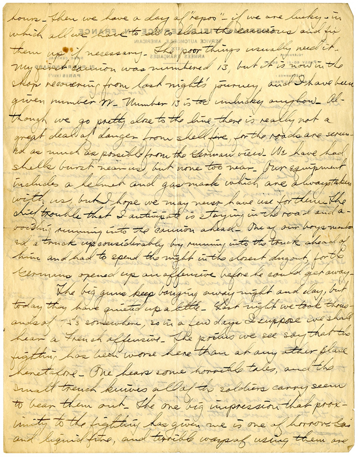 hours. Then we have a day of "repos" - if we are lucky, in which all we have to do clean the camions and fix them up if necessary. The poor things usually need it. My first camion was numbered 13, but it is now in the shop recovering from last night's journey, and I have been given number 22. Number 13 is too unlucky anyhow. Although we go pretty close to the line, there is really not a great deal of danger from shell fire, for the roads are screened as much as possible from the German view. We have had shells burst near us, but none too near. Our equipment includes a helmet and gas mask which are always taken with us, but I hope we may never have use for them. The chief trouble that I antisipate is staying in the road and avoiding running into the camion ahead. One of our boys marked a truck up considerably by running into the truck ahead of him and had to spend the night in the closest dugout, for the Germans opened up an offensive before he could get away. The big guns keep banging away night and day, but today they have quieted up a little. Last night we took thousands of 75's somewhere, so in a few days I suppose we shall hear a French offensive. The poilus we see say that the fighting has been worse here than at any other place heretofore. One hear some horrible tales, and the small trench knives all of the soldiers carry seem to bear them out. The one big impression that proximity to the fighting has given me is one of horror. Gas and liquid fire, and terrible ways of using them are