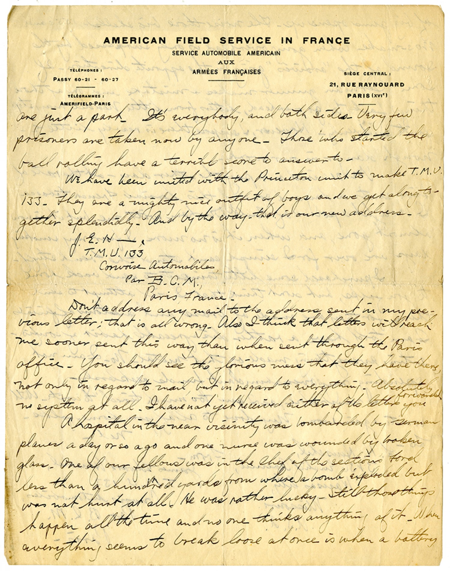 are just a part. It's everybody, and both sides. Very few prisoners are taken now by anyone. Those who started the ball rolling have a terrible score to answer to. We have been united with the Princeton unit to make T.M.U. 133. They are a mighty nice outfit of boys and we get along together splendidly. And by the way, that is our new address. J.E.H - T.M.U. 133 Convoise Automobiles, Par B.C.M., Paris, France. Don't address any mail to the address sent in my previous letter; that is all wrong. Also I think that letters will reach me sooner went this way than when sent through the Paris office. You should see the glorious mess that they have there, not only in regard to mail, but in regard to everything. Absolutely no system at all. I have not yet received either of the letters you forwarded. A hospital in the near visinity was bombarded by German planes a day or so ago and one nurse was wounded by broken glass. One of our fellows was in the Chef of the sections ford less than a hundred yards from where a bomb exploded but was not hurt at all. He was rather lucky. Still those things happen all the time and no one thinks anything of it. When everything seems to break loose at once is when a battery
