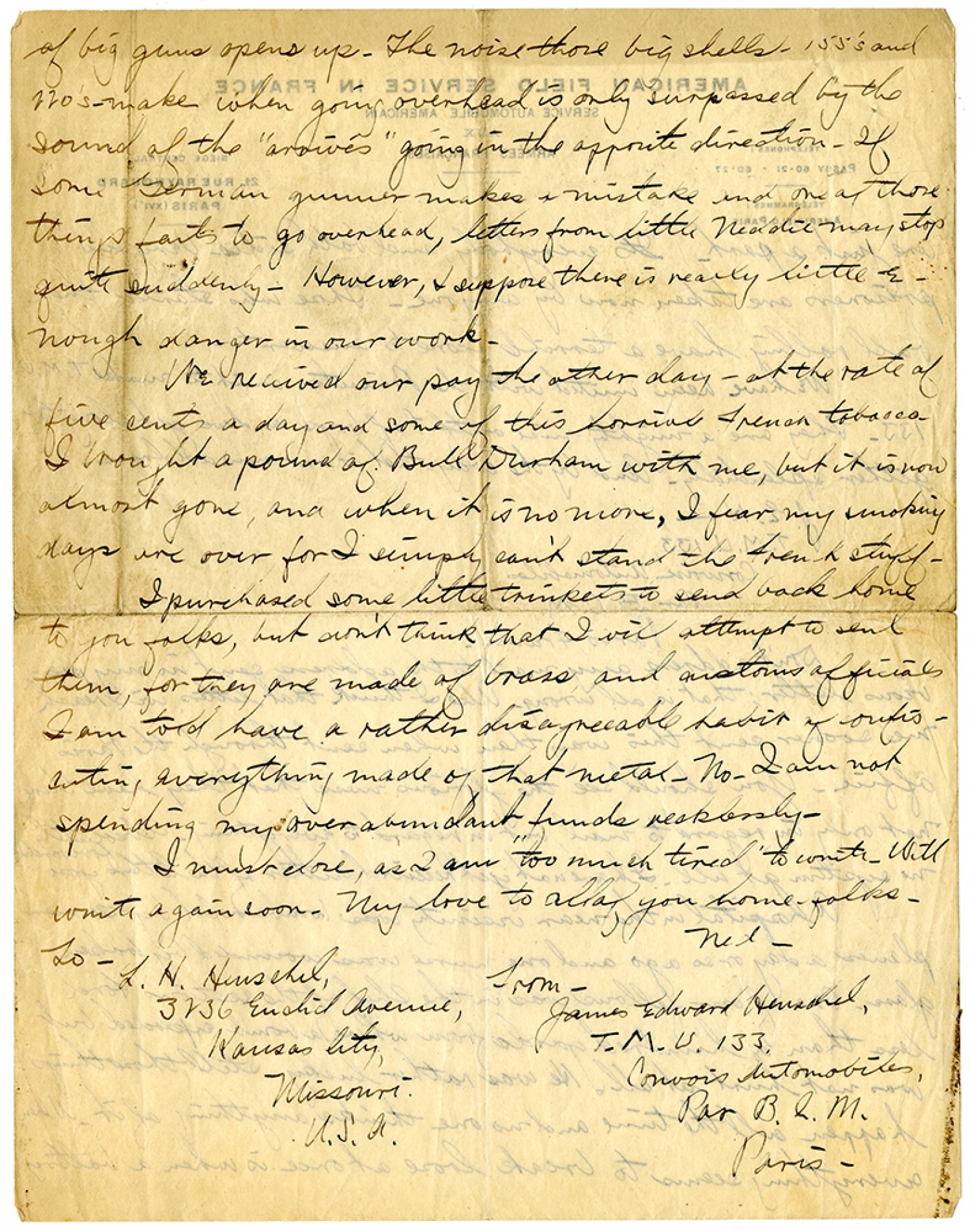 of big guns opens up. The noise those big shells - 155's and 220's - made when going overhead is only surpassed by the sound of the "arrives" going in the opposite direction. If some German gunner makes a mistake and one of those things fails to go overhead, letters from little Neddie may stop quite suddenly. However, I suppose there is really little enough danger in our work. We received our pay the other day - at the rate of five cents a day and some of this horrible French tobacco. I brought a pound of Bull Durham with me, but it is now almost gone, and when it is no more, I fear my smoking days are over for I simply can't stand the French stuff. I purchased some little trinkets to send back home to you folks, but don't think that I will attempt to send them, for they are made of brass and customs officials I am told have a rather disagreeable habit of confiscating everything made of that metal - No - I am not spending my over abundant funds recklessly. I must close, as I am "too much tired" to write. Will write again soon. My love to all of you home-folks. Ned. To- L.H. Henschel 3236 Euclid Avenue, Kansas City, Missouri, U.S.A. From- James Edward Henschel, T.M.U. 133, Convois Automobiles, Par B.C.M. Paris.