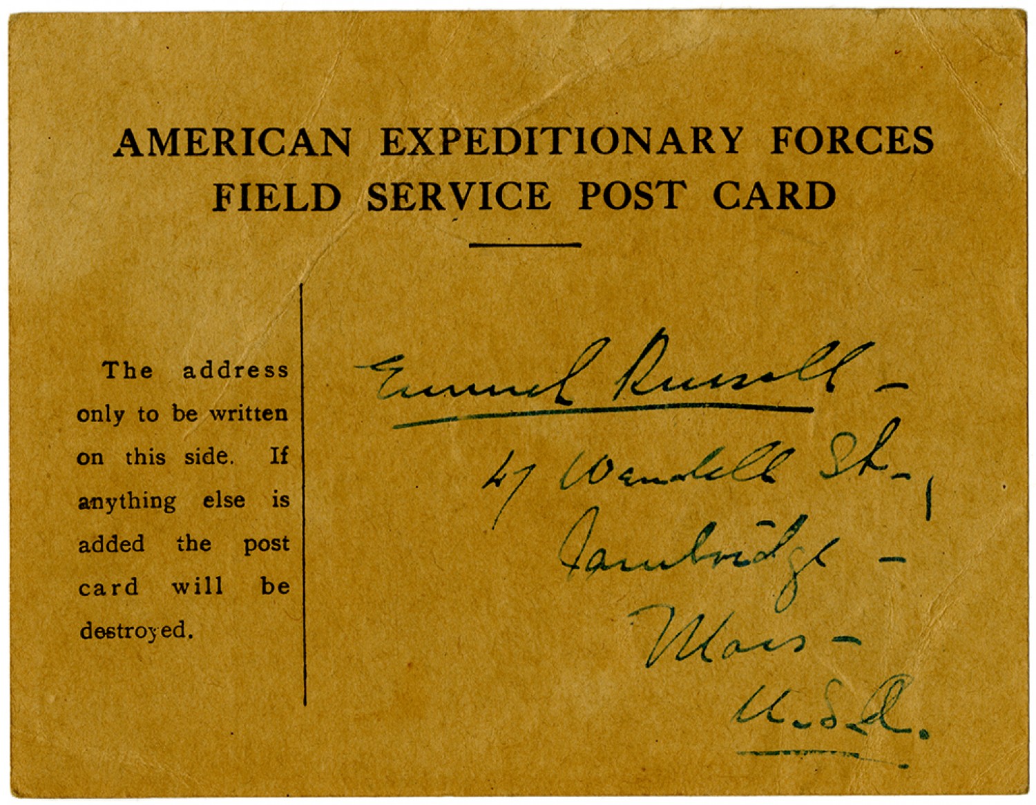 American Expeditionary Forces Field Service Post Card The Address only to be written on this side. If anything else is added the post card will be destroyed. Emmet Russell - 47 Wendell St., Cambridge- [Massachusetts] - U.S.A.