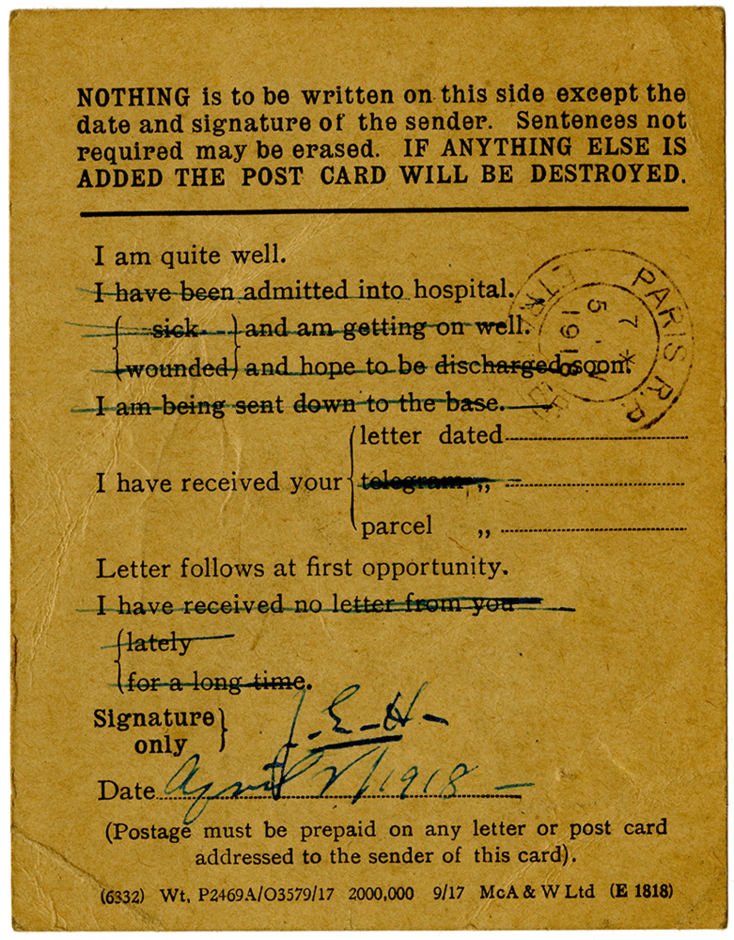 NOTHING is to be written on this side except the data and signature of the sender. Sentences not required may be erased. IF ANYTHING IS ADDED THE POST CARD WILL BE DESTROYED. I am quite well. I have received your letter dated parcel " Letter follows at first opportunity. Signature only J.E.H. Date April 2/1918 - (Postage must be prepaid on any letter or post card addressed to the sender of this card).