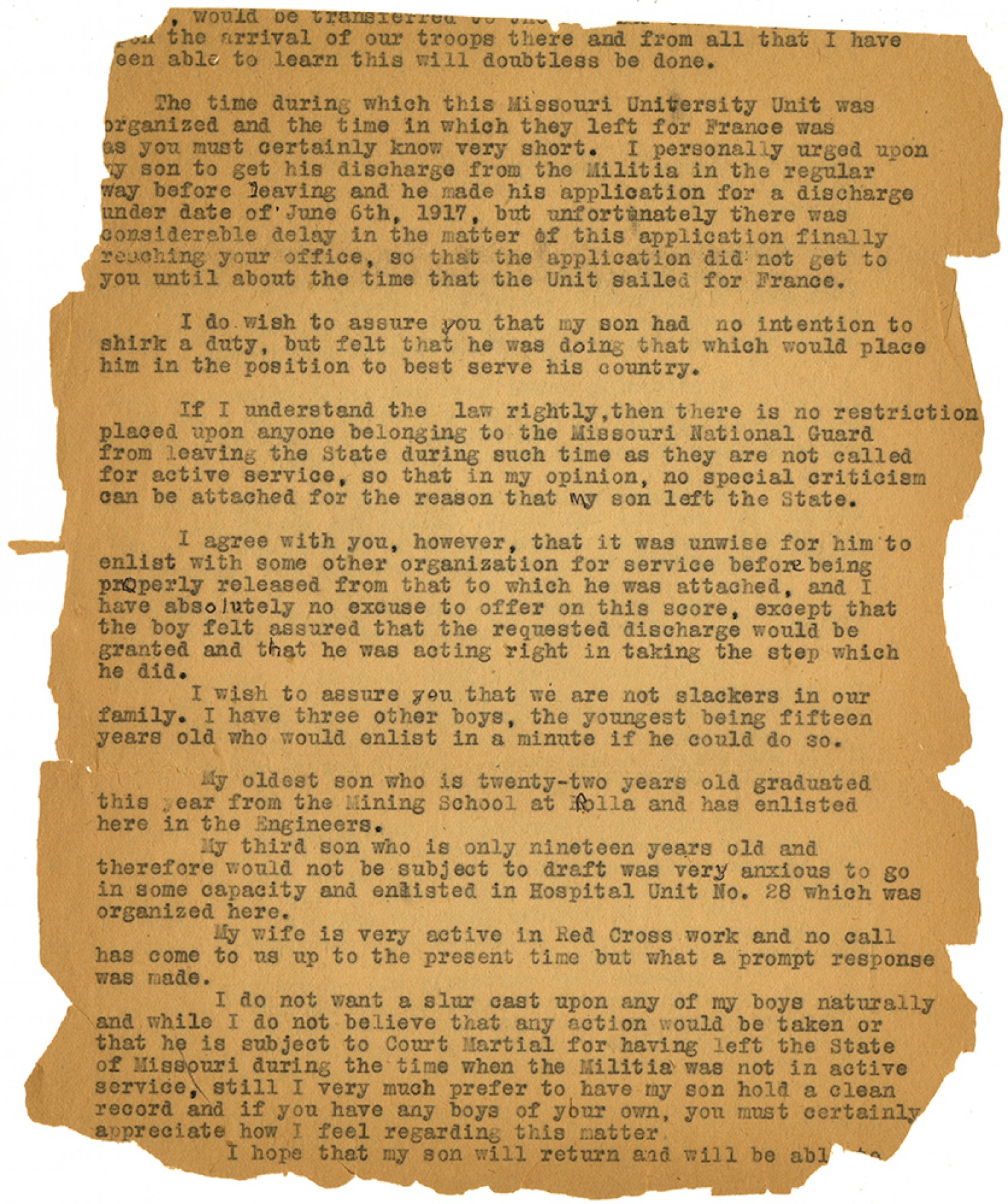 [ms illegible: 1 wd], would be transferred to the [ms torn] on the arrival of our troops there and from all that I have [been] able to learn this will doubtless be done. The time during which this Missouri University Unit was organized and the time in which they left for France was as you must certainly know very short. I personally urged upon my son to get his discharge from the Militia in the regular way before leaving and he made his application for a discharge under date of June 6th, 1917, but unfortunately there was considerable delay in the matter of this application finally reaching your office, so that the application did not get to you until about the time that the Unit sailed for France. I do wish to assure you that my son had no intention to shirk a duty, but felt that he was doing that which would place him in the position to best serve his country. If I understand the law rightly, then there is no restriction placed upon anyone belonging to the Missouri National Guard from leaving the State during such time as they are not called for active service, so that in my opinion, no special criticism can be attached for the reason that my son left the State. I agree with you, however, that it was unwise for him to enlisted with some other organization for service before being properly released from that to which he was attached, and I have absolutely no excuse to offer on this score, except that the boy felt assured that the requested discharge would be granted and that he was acting right in taking the step which he did. I wish to assure you that we are not slackers in our family. I have three other boys, the youngest being fifteen years old who would enlist in a minute if he could do so. My oldest son who is twenty-two years old graduated this year from the Mining School at Rolla and has enlisted here in the Engineers. My third son who is only nineteen years old and therefore would not be subject to draft was very anxious to go in some capacity and enlisted in Hospital Unit No. 28 which was organized here. My wife is very active in Red Cross work and no call has come to us up to the present time but what a prompt response was made. I do not want a slur cast upon any of my boys naturally and while I do not believe that any action would be taken or that he is subject to Court Martial for having left the State of Missouri during the time when the Militia was not in active service, still I very much prefer to have my son hold a clean record and if you have any boys of your own, you must certainly appreciate how I feel regarding this matter. I hope that my son will return and will be [able to]