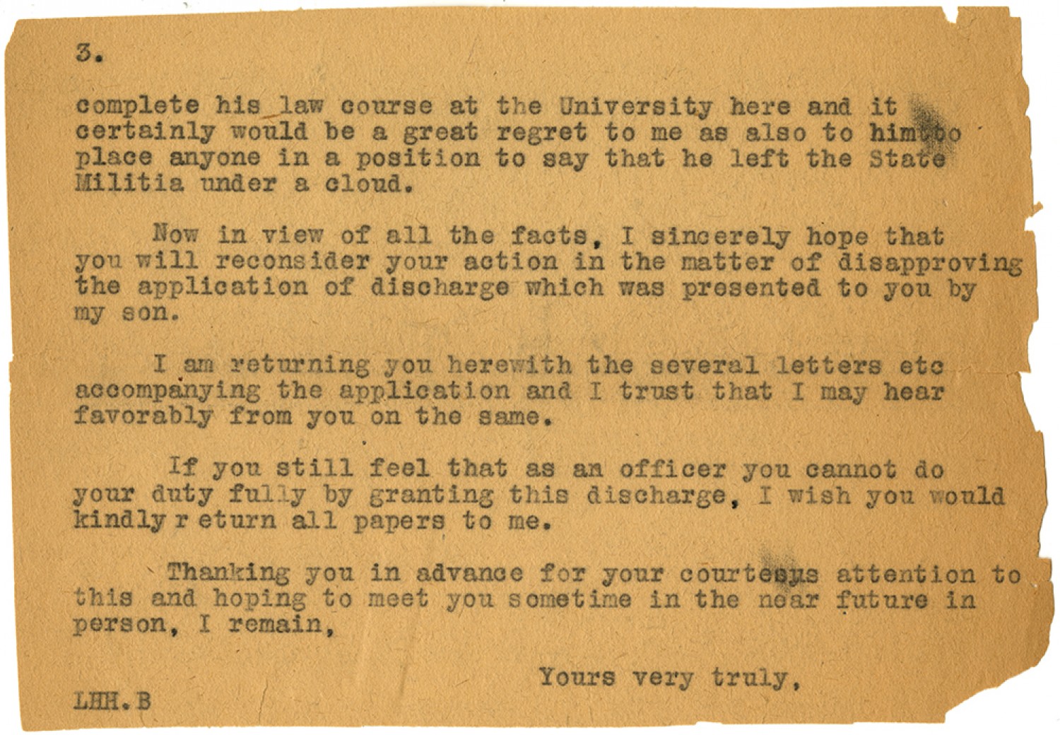 [Page 3] complete his law course at the University here and it certainly would be a great regret to me as also to him to place anyone in a position to say that he left the State Militia under a cloud. Now in view of all the facts, I sincerely hope that you will reconsider your action in the matter of disapproving the application of discharge which was presented to you by my son. I am returning you herewith several letters etc accompanying the application and I trust that I may hear favorably from you on the same. If you still feel that as an officer you cannot do your duty fully by granting this discharge, I wish you would kindly return all papers to me. Thanking you in advance for you courteous attention to this and hoping to meet you sometime in the near future in person, I remain, Yours very truly, LHH.B