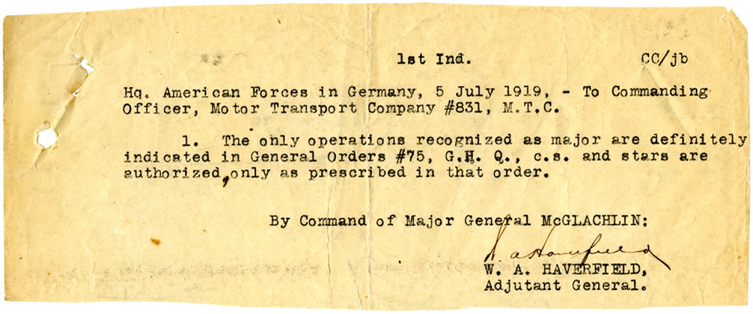 1st Ind. CC/jb Hq. American Forces in Germany, 5 July 1919, - To Commanding Officer, Motor Transport Company #831, M.T.C. 1. The only operations recognized as major are definitely indicated in General Orders #75, G.H.Q., c.s. and stars are authorized, only as prescribed in that order. By Command of Major General McGLACHLIN: W. A. Haverfield, Adjutant General.
