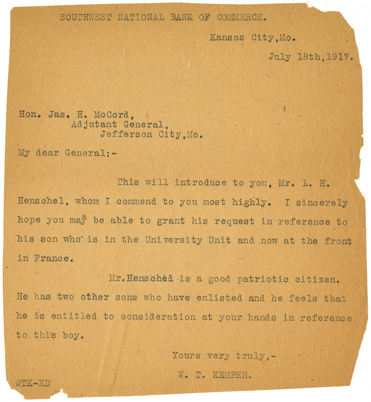 SOUTHWEST NATIONAL BANK OF COMMERCE. Kansas City, [Missouri] July 18th, 1917. Hon. Jas. H. McCord Adjutant General, Jefferson City, [Missouri] My dear General:- This will introduce to you, Mr. L. H. Henschel, whom I commend to you most highly. I sincerely hope you may be able to grant his request in reference to his son who is in the University Unit and now at the front in France. Mr. Henschel is a good patriotic citizen. He has two other sons who have enlisted and he feels that he is entitled to consideration at your hands in reference to this boy. Yours very truly,- W. T. KEMPER. WTK-ED