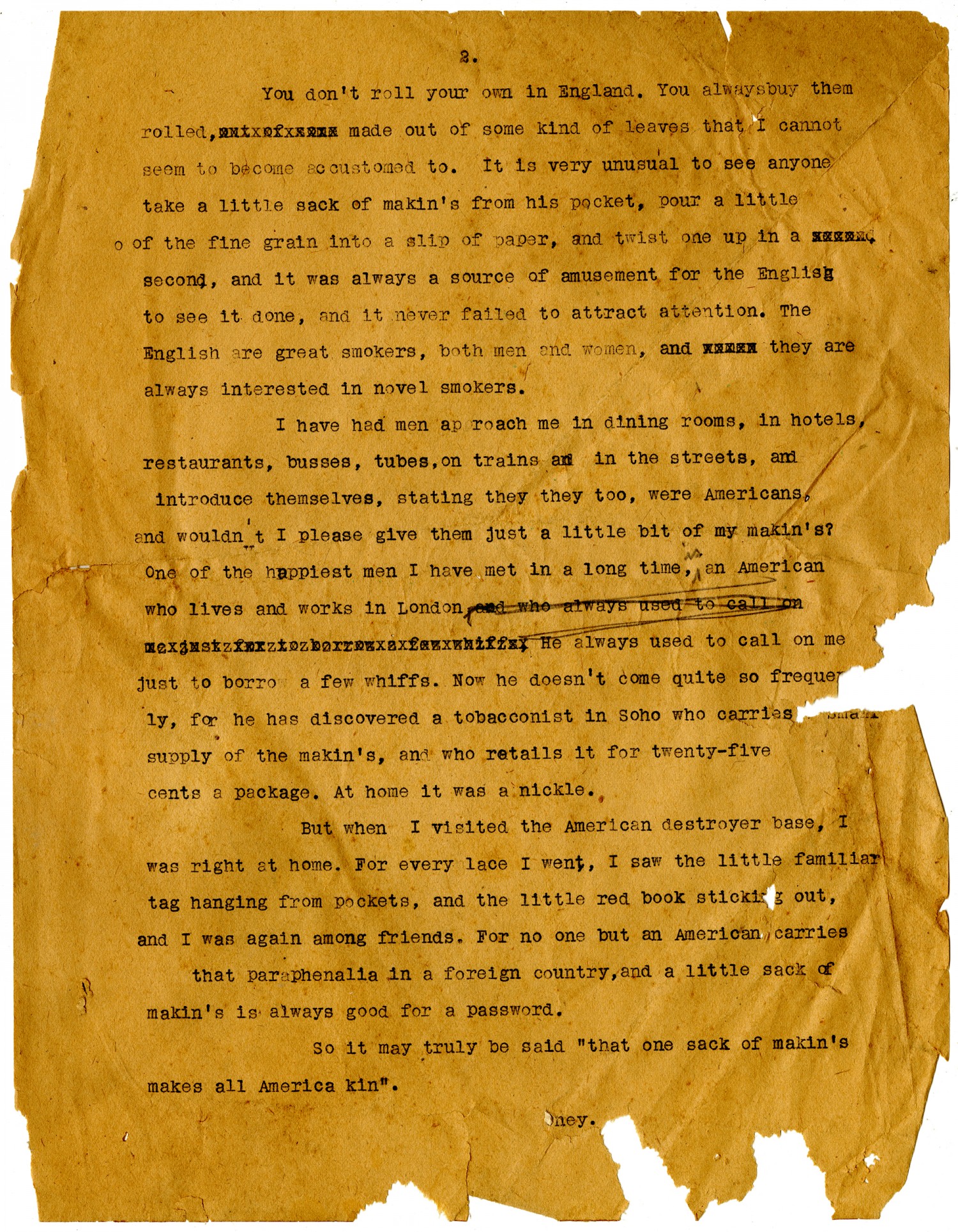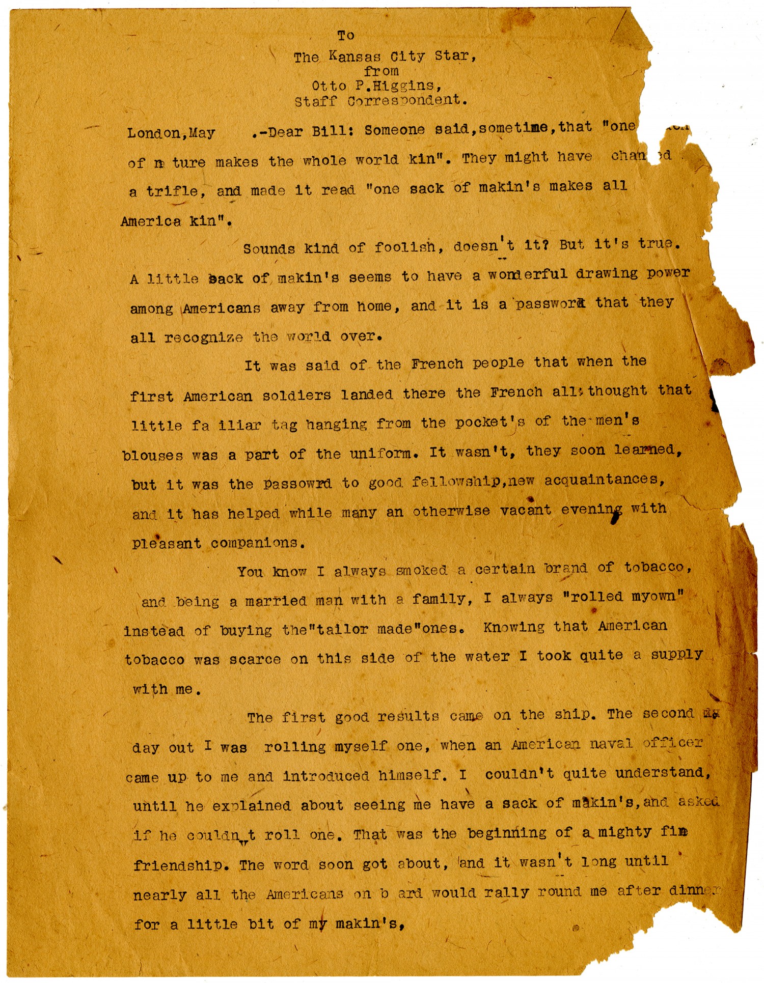 | Description | Otto P. Higgins did not serve in the United States military, but he spent the entire span of the war in training camps and overseas with the army as a staff correspondent for the Kansas City Star. He wrote about soldiers from the Mid-West, especially Missouri and Kansas. Higgin's began his service with the old Third Regiment, and was with regiments at Camp Nichols, Fort Riley, Camp Funston, Camp Doniphan, Fort Leavenworth, Fort Sheridan, and finally in France. In this story, Otto P. Higgins of the Kansas City Star wrote to a man named Bill about the bond all men shared overseas, which he explained was smoking cigarettes. Makin's were a particular brand of cigarette that the French and English found especially appealing. Foreigners would ask American soldiers for one of their Makin's, and the two soldiers would then share a cigarette and a bond. Higgins closed by stating 'one sack of makin's makes all America kin.' |
