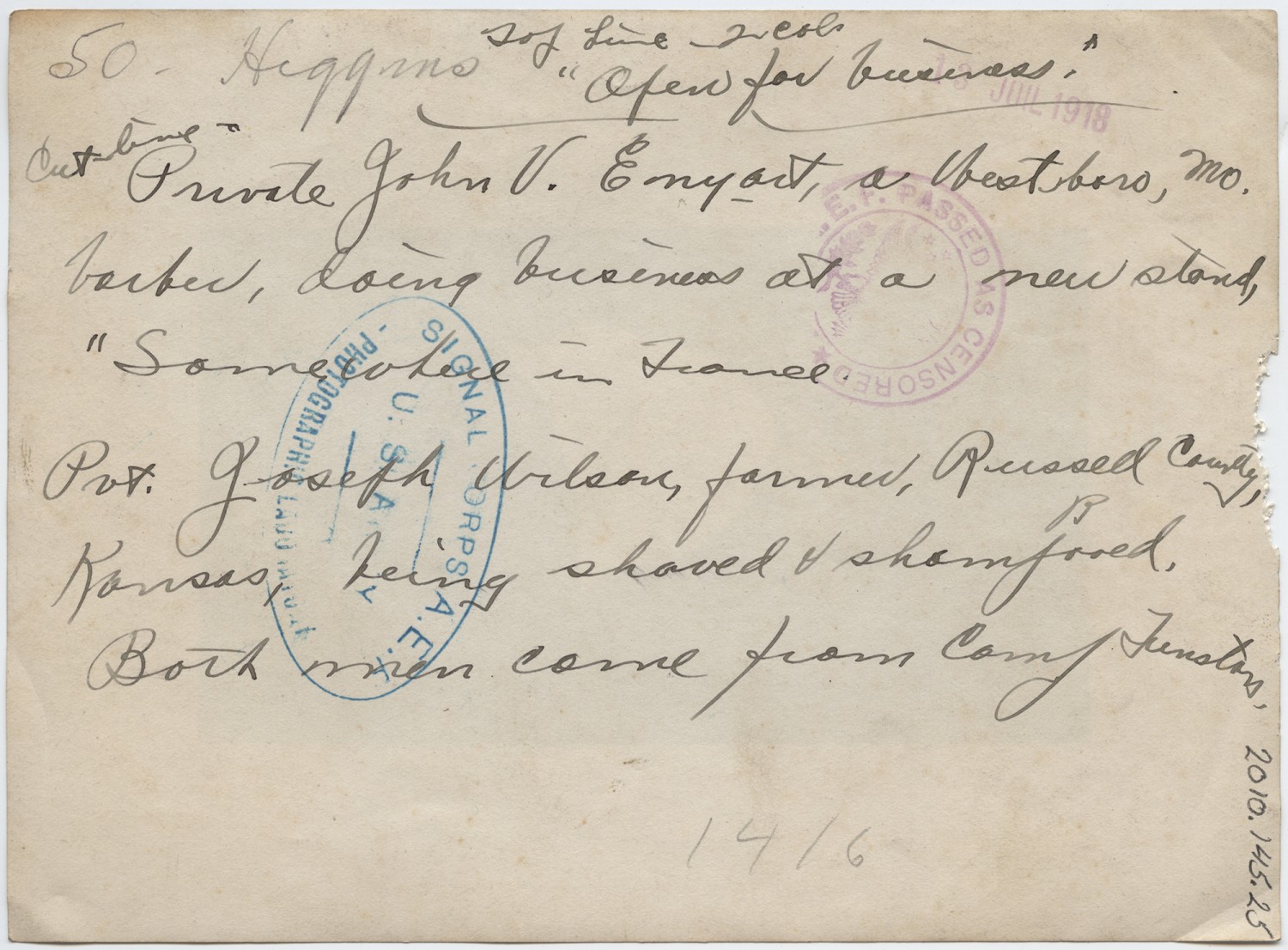 | Source | Higgins, Otto P. Barber. n.d. Higgins, Otto P. Collection. 2010.145.25. The National World War I Museum, Kansas City, Missouri. |