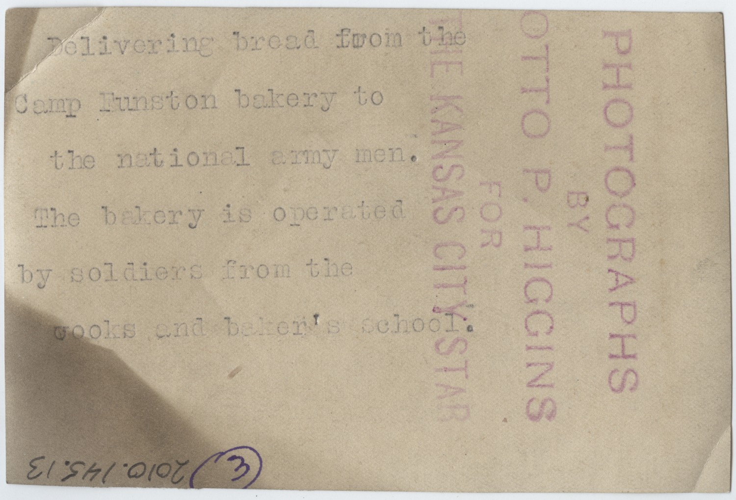 | Description | Otto Higgins did not serve in the United States military, but was assigned as a war correspondent for the Kansas City Star soon after the United States entered the world conflict and was with the American forces in all the major engagements in which they participated. He wrote about and photographed soldiers from the Mid-West, especially Missouri and Kansas. Higgin's began his service with the old Third Regiment, and was with regiments at Camp Nichols, Fort Riley, Camp Funston, Camp Doniphan, Fort Leavenworth, Fort Sheridan, and finally in France. This is a photograph of two soldiers delivering bread at Camp Funston. The bakery at Funston was operated by soldiers from the cooks and bakers school. |