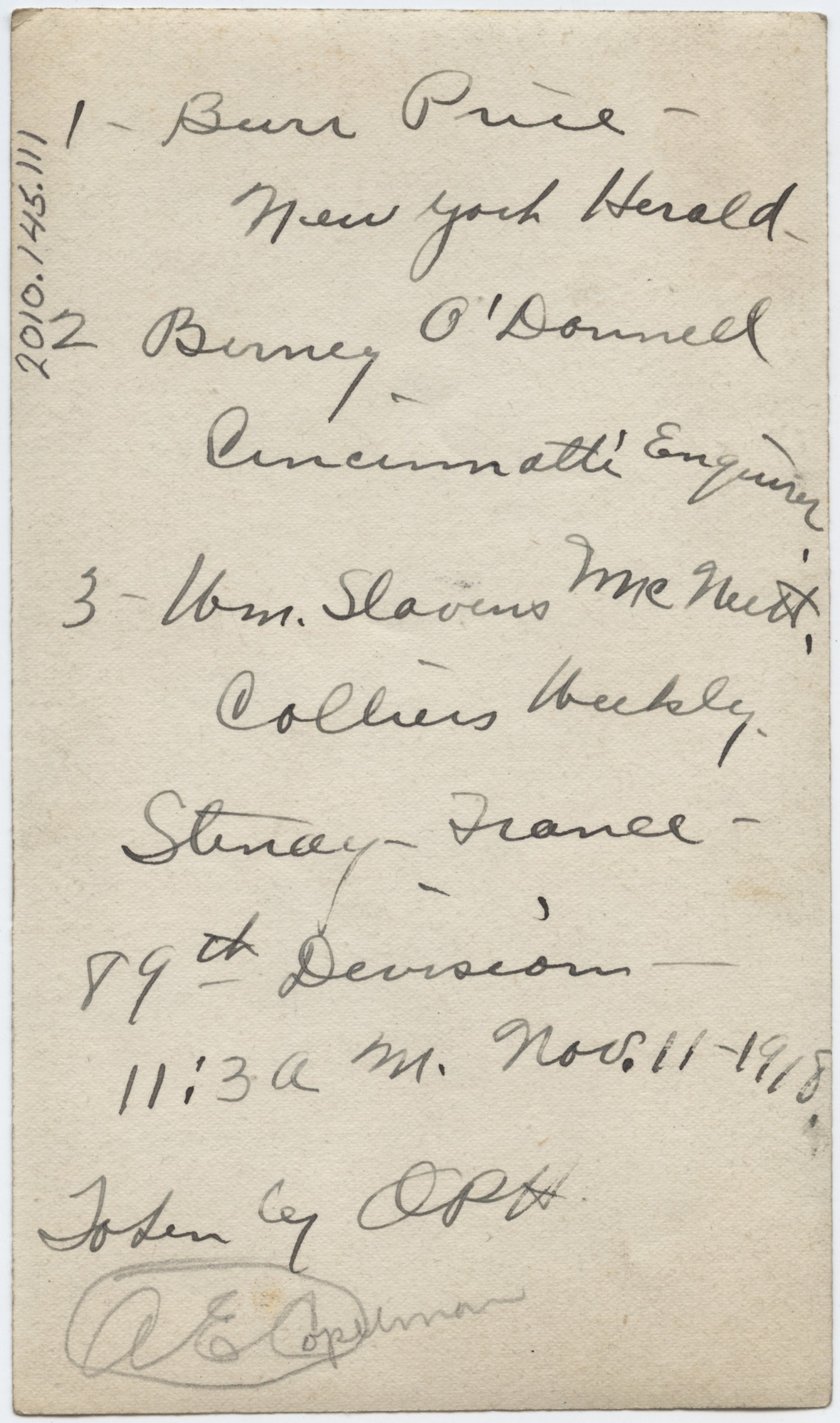 | Source | Higgins, Otto P. Group including newspaper correspondents. 11 November 1918. Higgins, Otto P. Collection. 2010.145.111. The National World War I Museum, Kansas City, Missouri. |