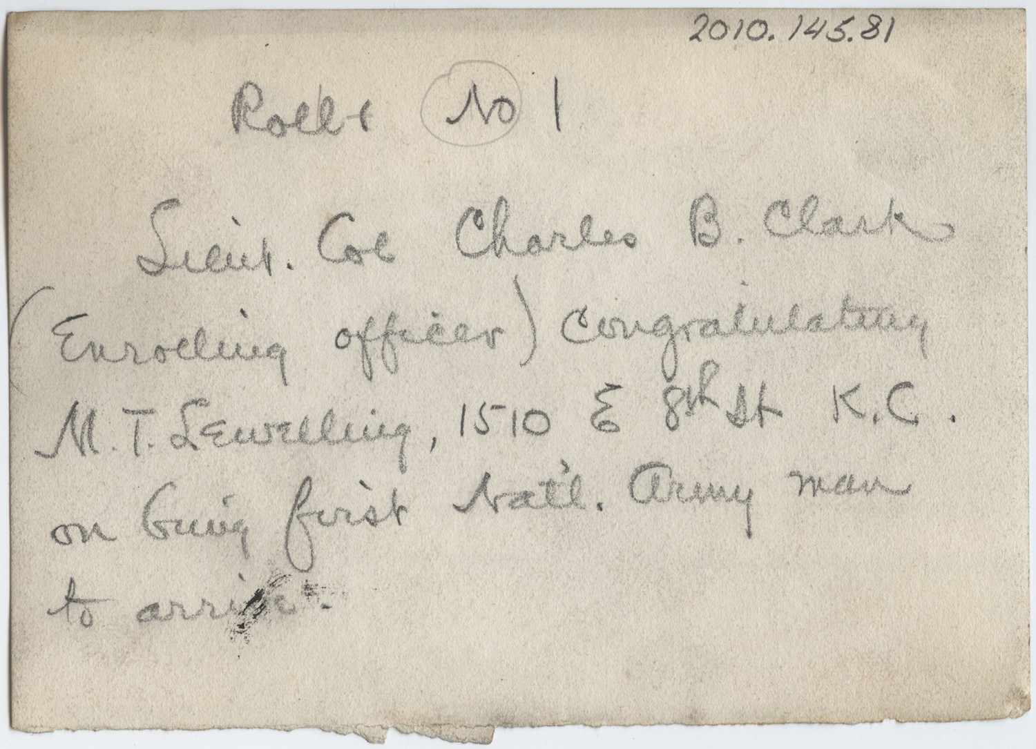Roll No 1 Lieut. Col Charles B. Clark (Enrolling Officer) Congratulating M.T. Lewelling, 1510 E. 8th St [Kansas City] on being first Natl. Army man to arrive.