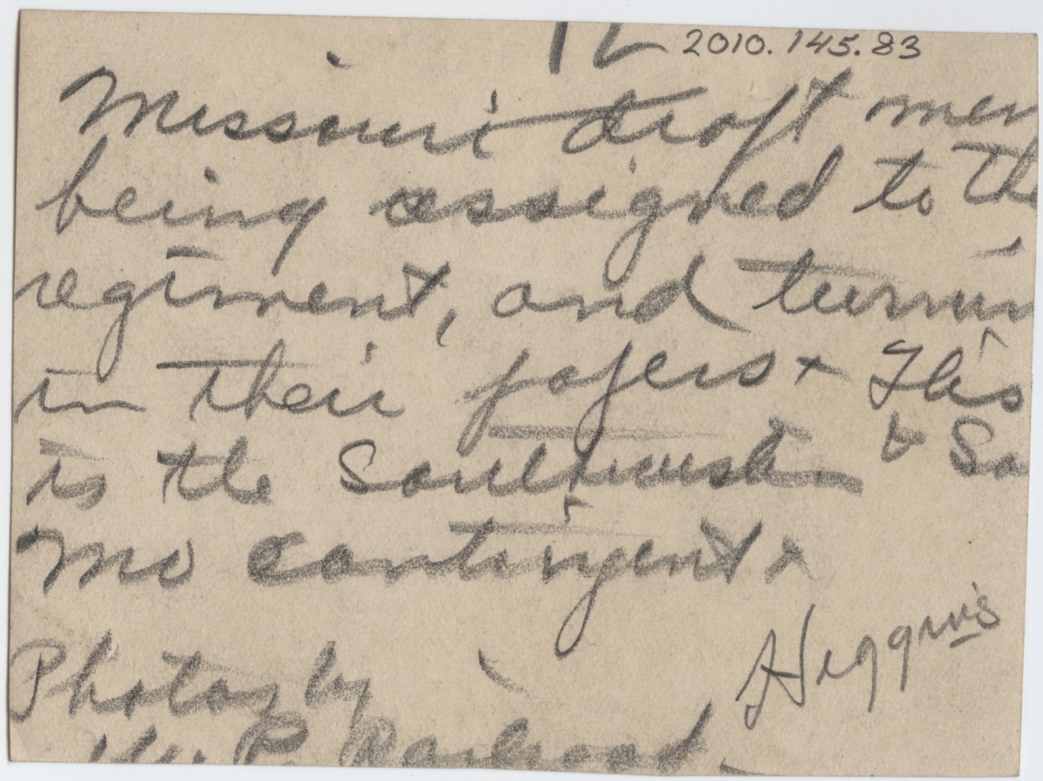 Missouri draft men being assigned to the regiment, and turning in their papers. This is the [ms illegible: 1 wd]. [ms incomplete] [Missouri] contingent. Photos by [ms illegible: 2 wds] Higgins