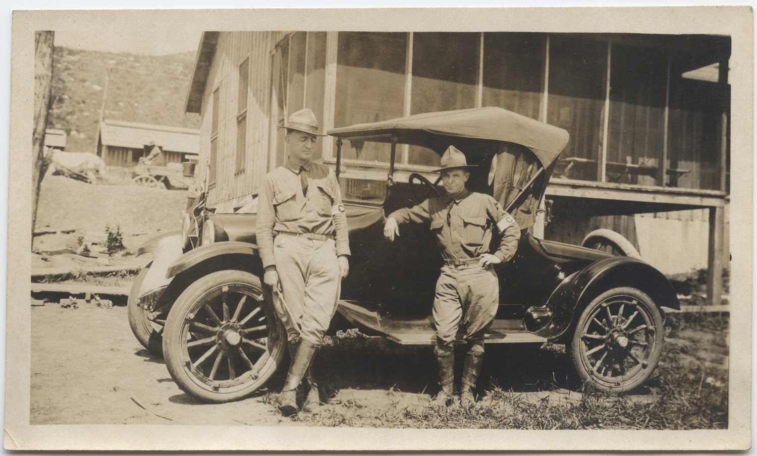 | Description | Otto Higgins did not serve in the United States military, but was assigned as a war correspondent for the Kansas City Star soon after the United States entered the world conflict and was with the American forces in all the major engagements in which they participated. He wrote about and photographed soldiers from the Mid-West, especially Missouri and Kansas. Higgin's began his service with the old Third Regiment, and was with regiments at Camp Nichols, Fort Riley, Camp Funston, Camp Doniphan, Fort Leavenworth, Fort Sheridan, and finally in France. This is a photograph of two news correspondents in front of a car at a military training camp. |