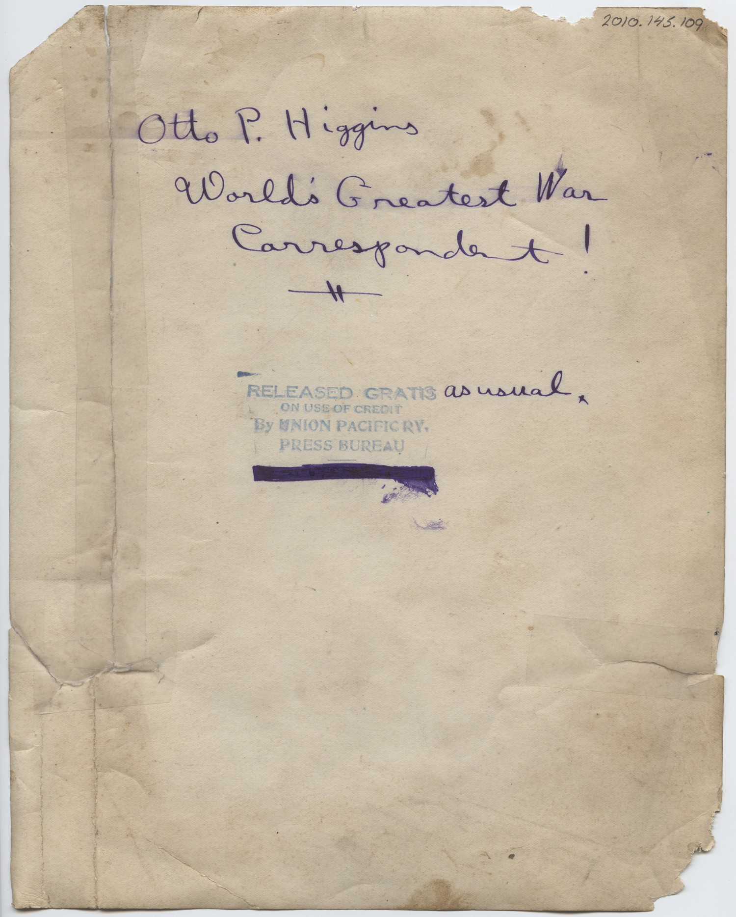 Otto P. Higgins Worlds Greatest War Correspondent! [stamp] Released Gratis [handwritten] as usual [stamp] on use of credit by Union Pacific RY. Press Bureau