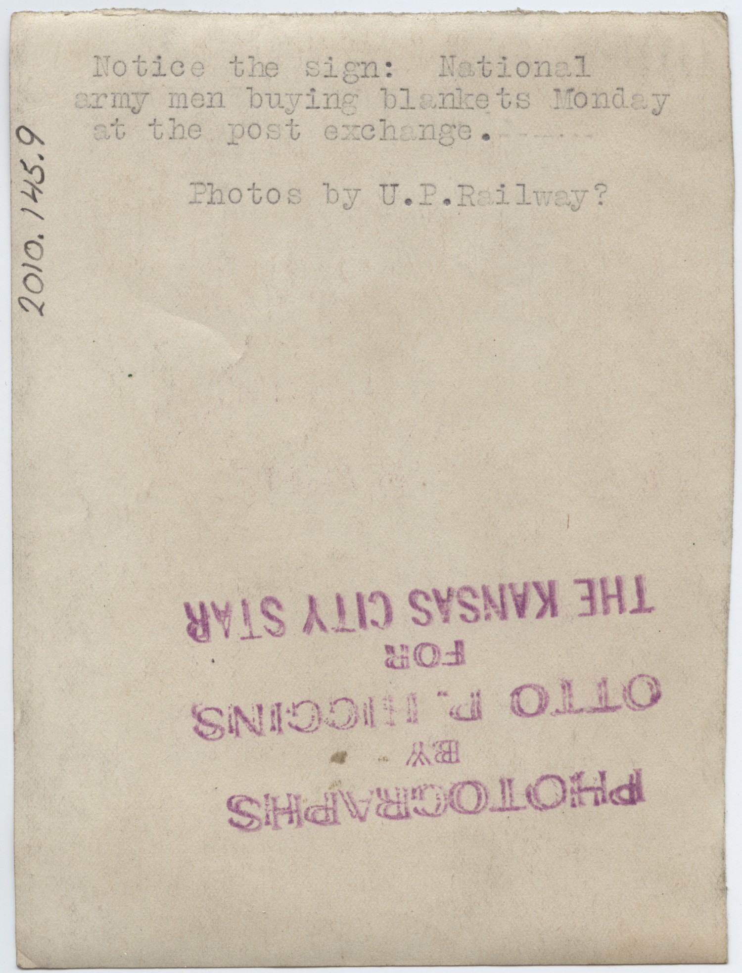 Notice the sign: National army men buying blankets Monday at the post exchange. Photos by U.P. Railway? [stamp] Photographs by Otto P. Higgins For The Kansas City Star