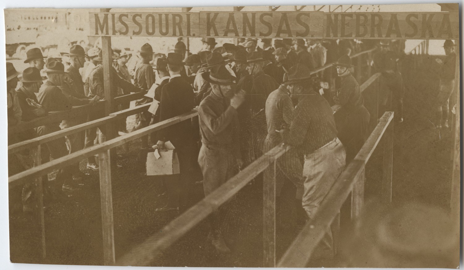 | Description | Otto Higgins did not serve in the United States military, but was assigned as a war correspondent for the Kansas City Star soon after the United States entered the world conflict and was with the American forces in all the major engagements in which they participated. He wrote and photographed soldiers from the Mid-West, especially Missouri and Kansas. Higgin's began his service with the old Third Regiment, and was with regiments at Camp Nichols, Fort Riley, Camp Funston, Camp Doniphan, Fort Leavenworth, Fort Sheridan, and finally in France. This is a photograph of men lining up to be received at Camp Funston. Signs over the lines read Missouri, Kansas, and Nebraska. |