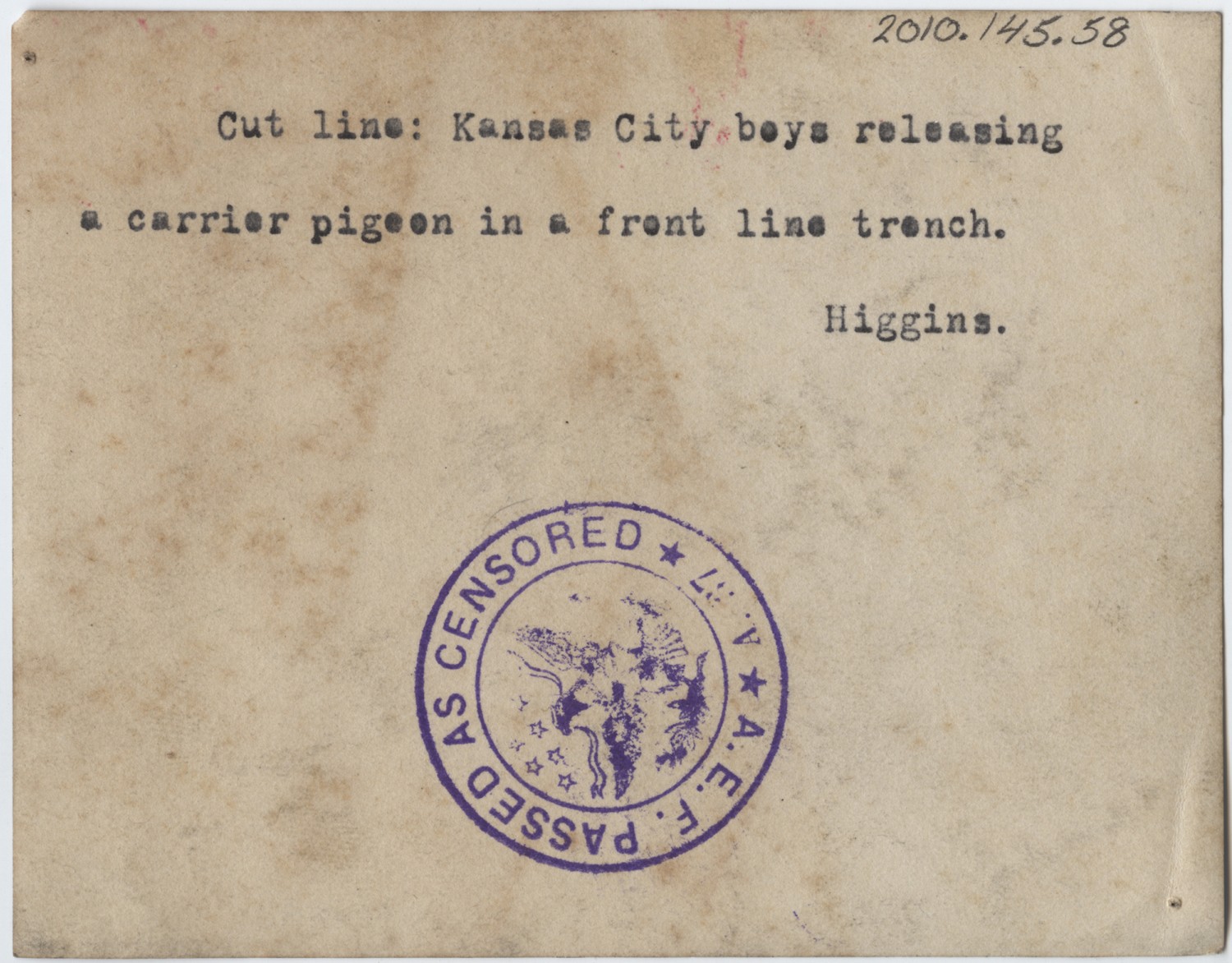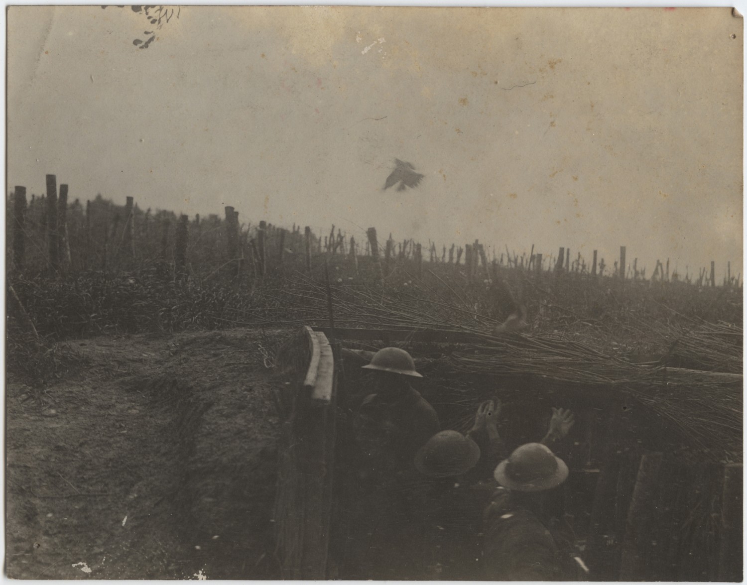 | Source | Higgins, Otto P. Releasing a carrier pigeon in a front line trench. n.d. Higgins, Otto P. Collection. 2010.145.58. The National World War I Museum, Kansas City, Missouri. |