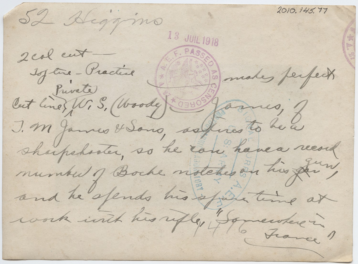 52 Higgins 2 col cut- Top line-Practice makes perfect Cut line: Private W.S. (Woody)- James, of J.M. James & Sons, aspires to be a sharpshooter, so he can have a record number of Boche notches on his gun, and he spends his spare time at work with his rifle,