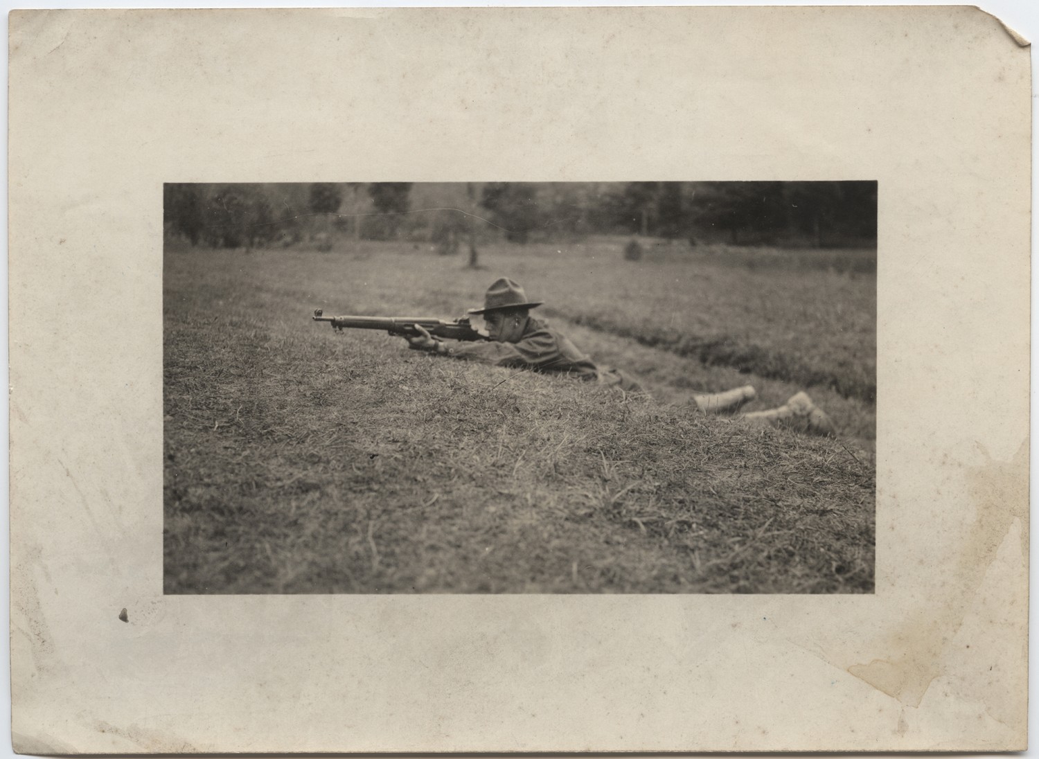 | Description | Otto Higgins did not serve in the United States military, but was assigned as a war correspondent for the Kansas City Star soon after the United States entered the world conflict and was with the American forces in all the major engagements in which they participated. He wrote and photographed soldiers from the Mid-West, especially Missouri and Kansas. Higgin's began his service with the old Third Regiment, and was with regiments at Camp Nichols, Fort Riley, Camp Funston, Camp Doniphan, Fort Leavenworth, Fort Sheridan, and finally in France. This is a photograph of W.S. Woody James, of J.M. James & Sons. He is practicing his sharpshooting skills somewhere in France. |