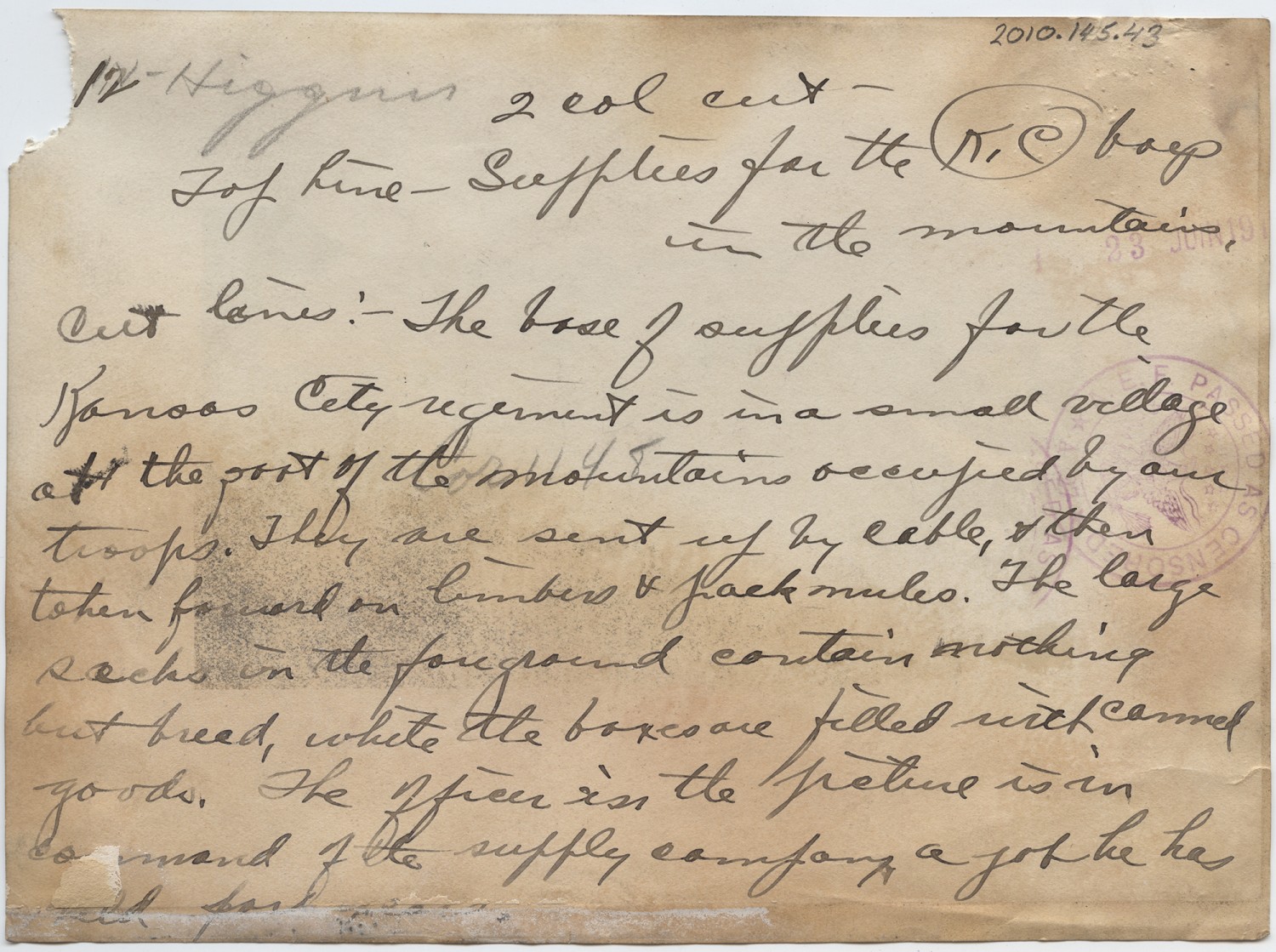 | Source | Higgins, Otto P. Supplies for the Kansas City boys. n.d. Higgins, Otto P. Collection. 2010.145.43. The National World War I Museum, Kansas City, Missouri. |